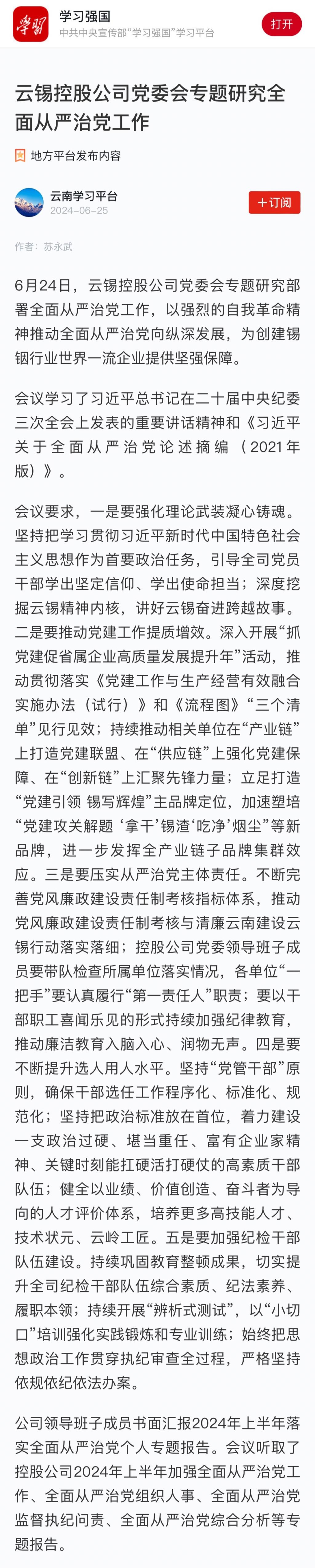 学习强国:云锡控股公司党委会专题研究全面从严治党工作
