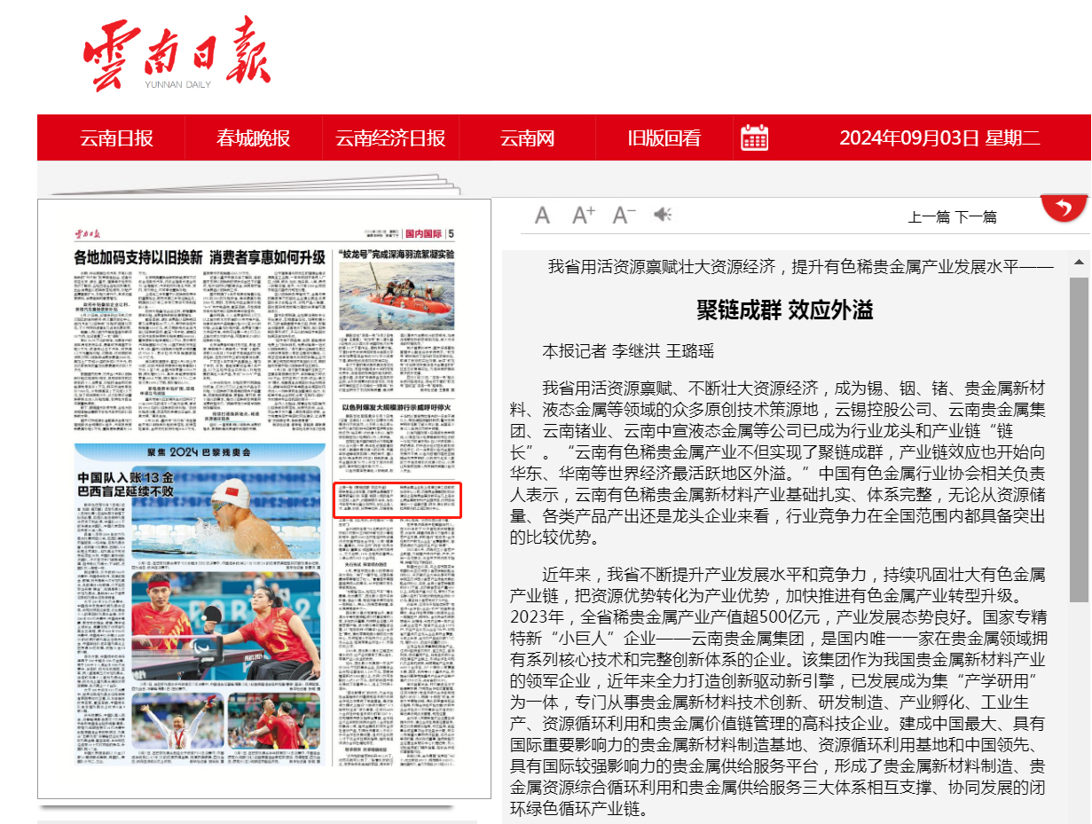 我省用活资源禀赋、不断壮大资源经济,成为锡、铟、锗、贵金属新材料、液态金属等领域的众多原创技术策源地,云锡控股公司、云南贵金属集团、云南锗业、云南中宣液态金属等公司已成为行业龙头和产业链“链长”。“云南有色稀贵金属产业不但实现了聚链成群,产业链效应也开始向华东、华南等世界经济最活跃地区外溢。”中国有色金属行业协会相关负责人表示,云南有色稀贵金属新材料产业基础扎实、体系完整,无论从资源储量、各类产品产出还是龙头企业来看,行业竞争力在全国范围内都具备突出的比较优势。
