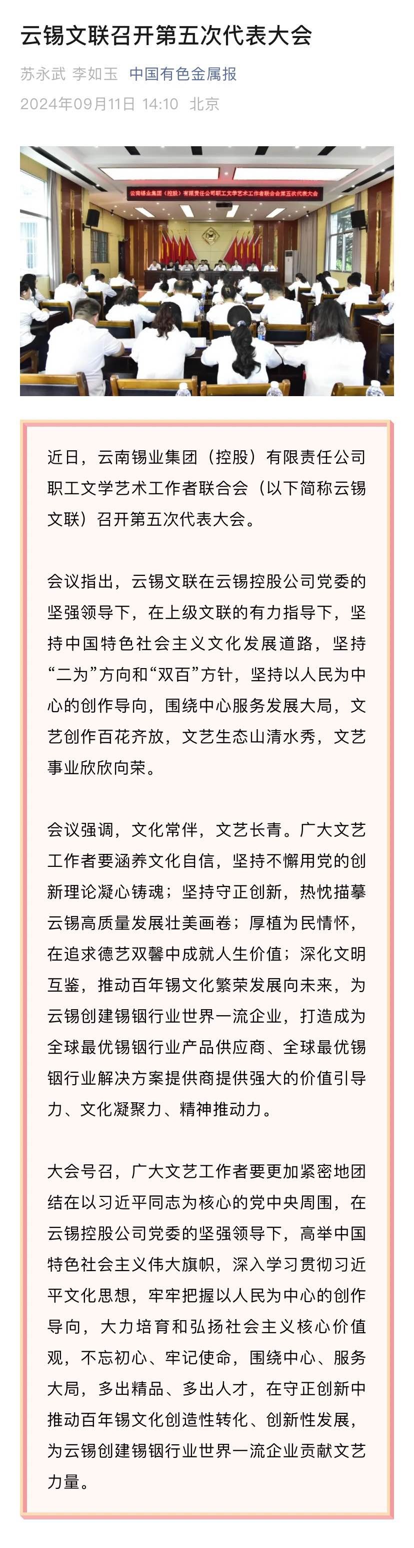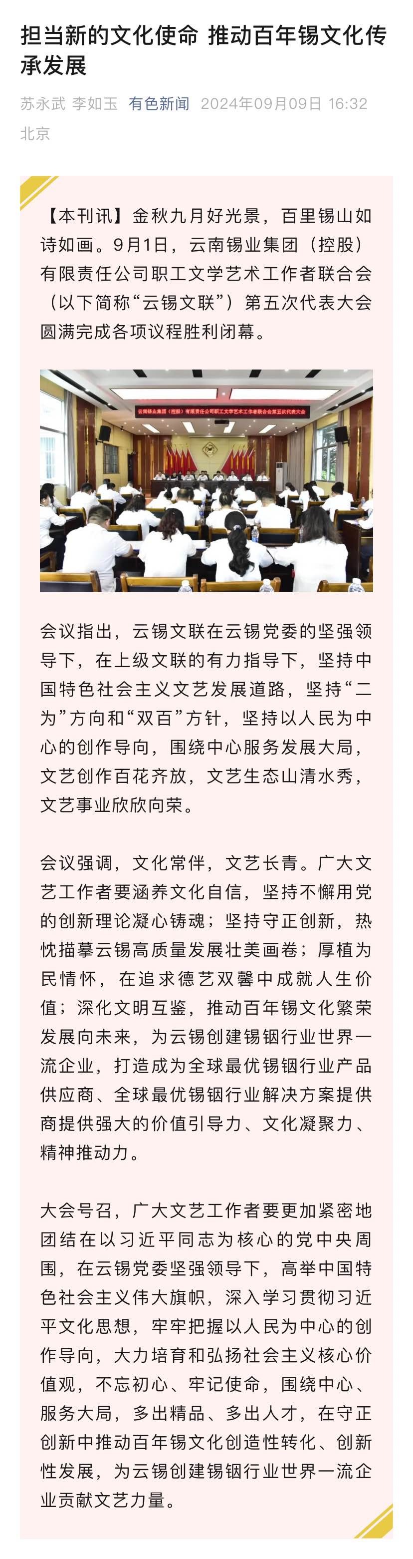 云南政协报、中国有色金属报、有色新闻:云锡文联召开第五次代表大会