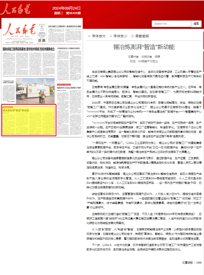 云南移动助力云锡打造的“数智工厂”项目,不仅入选《中国移动2023年可持续发展报告》,还荣获工信部第六届“绽放杯”5G应用征集大赛云南区域赛决赛二等奖,入选中央网信办2023年数字化绿色化协同转型发展优秀案例。