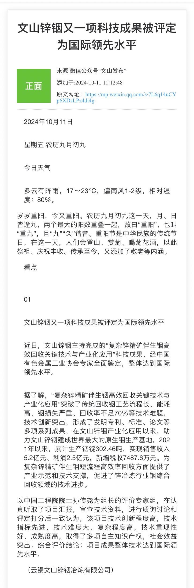 中国经济信息社:文山锌铟又一项科技成果被评定为国际领先水平
