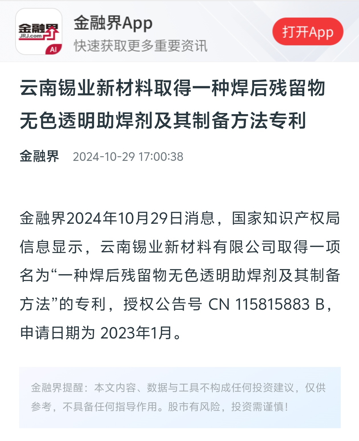 金融界:云南锡业新材料取得一种焊后残留物无色透明助焊剂及其制备方法专利
