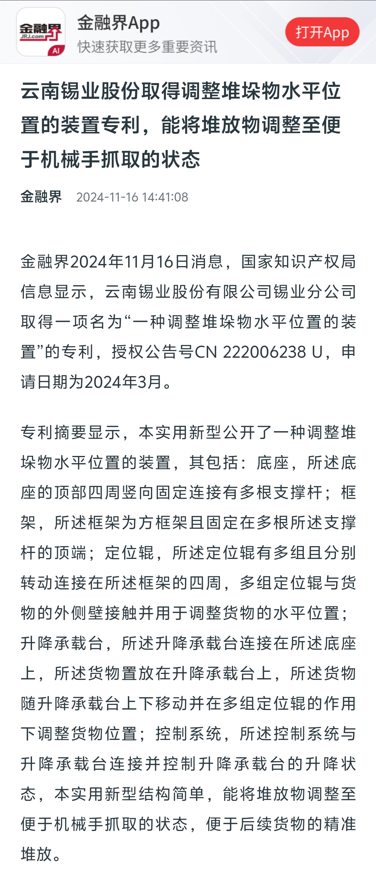 金融界:云南锡业股份取得调整堆垛物水平位置的装置专利,能将堆放物调整至便于机械手抓取的状态