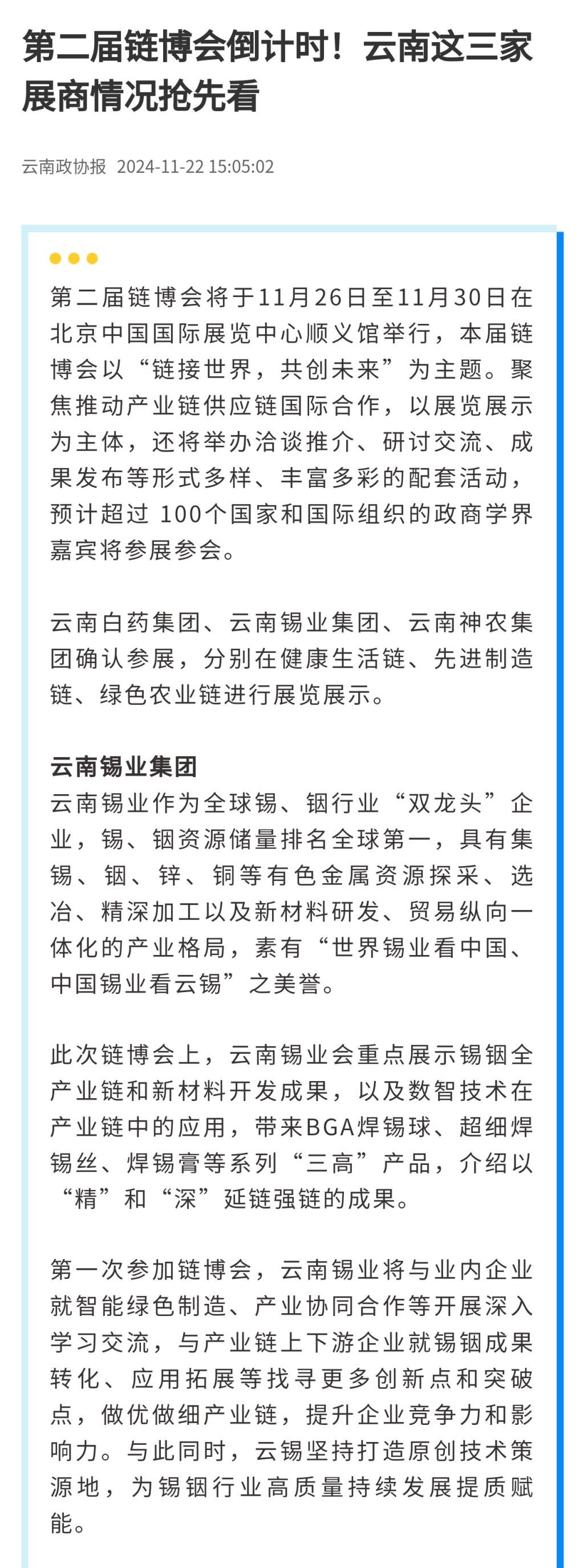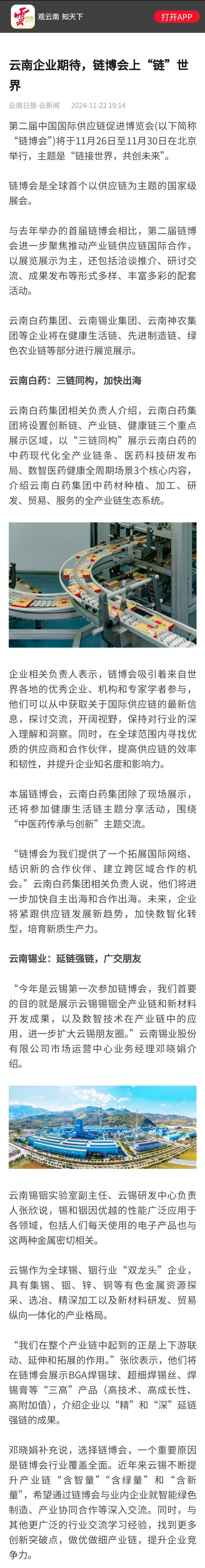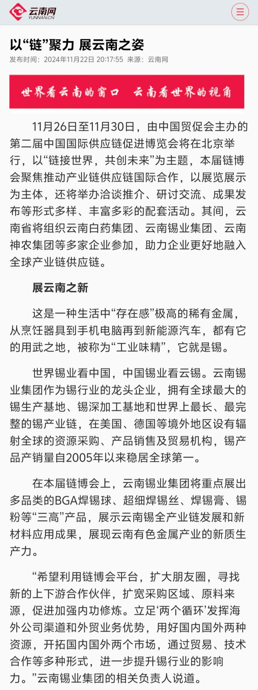 云南日报、云南网、云南政协报:云锡即将亮相第二届中国国际供应链促进博览会