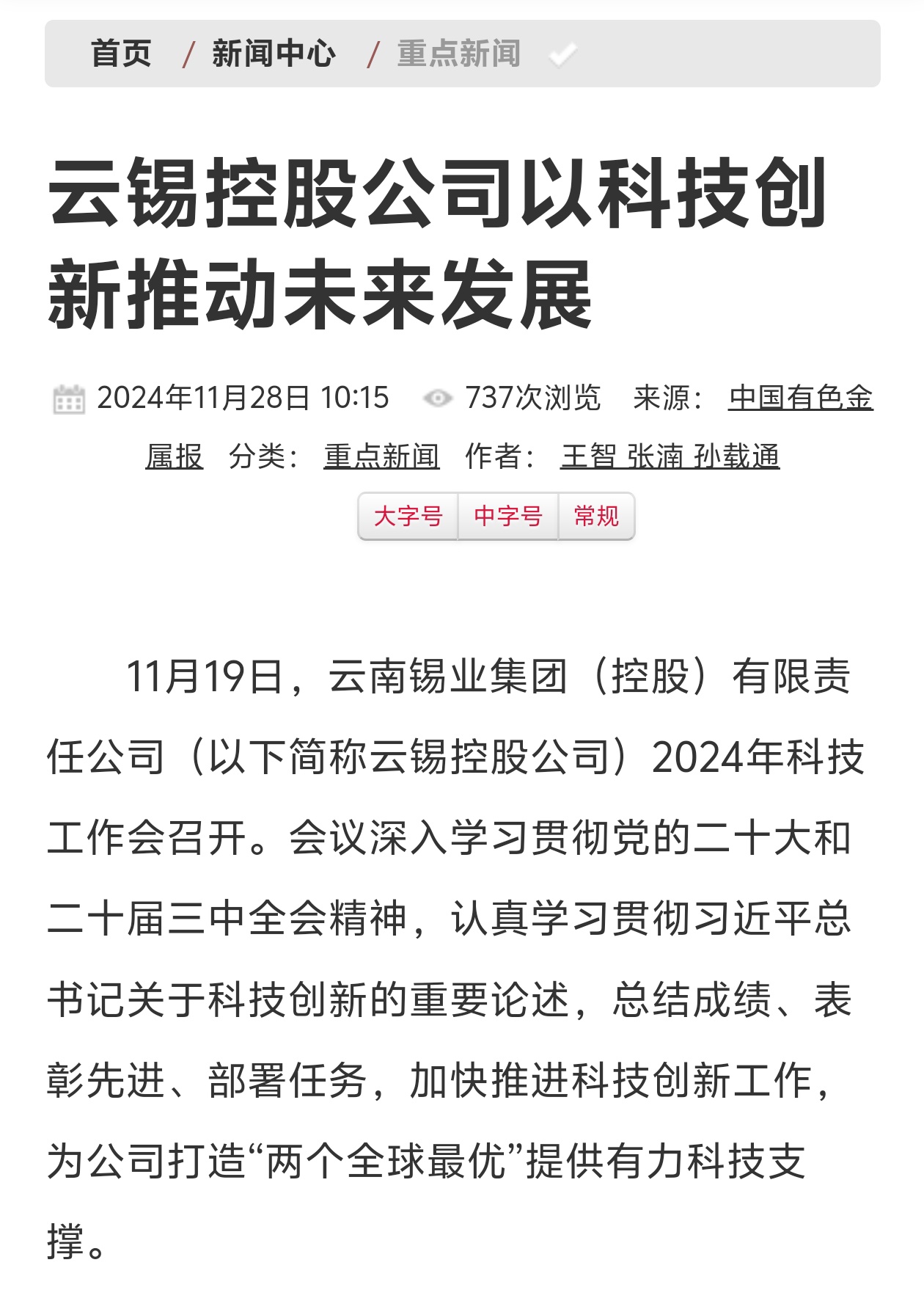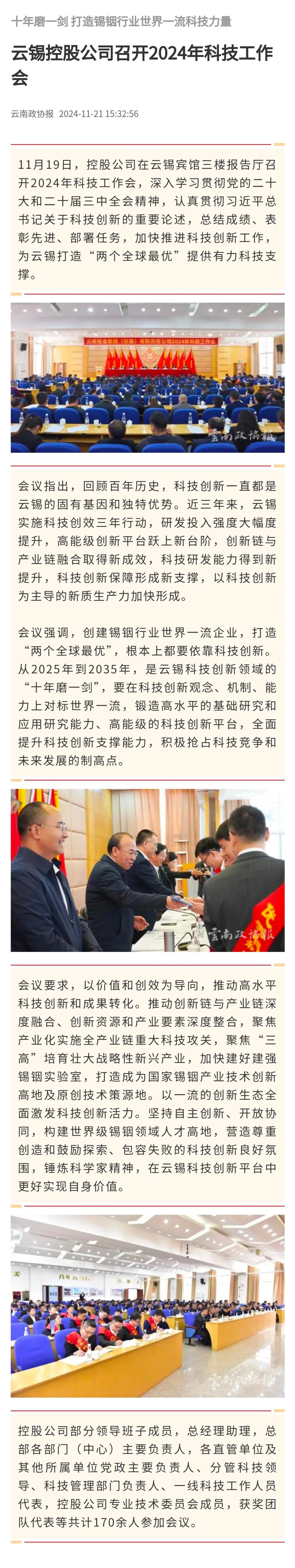 新华财经、云南政协报、中国有色金属报:云锡控股公司召开2024年科技工作会