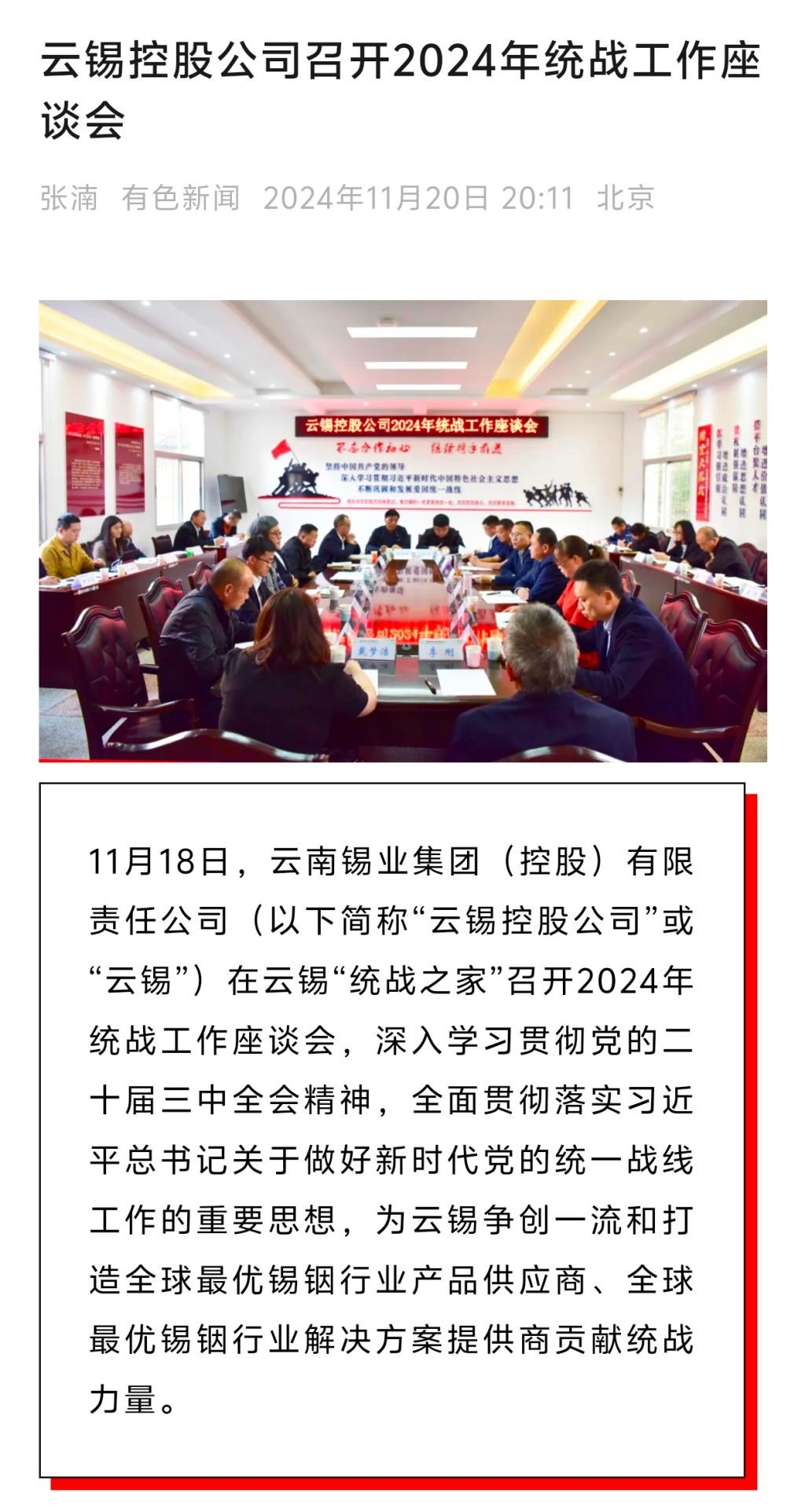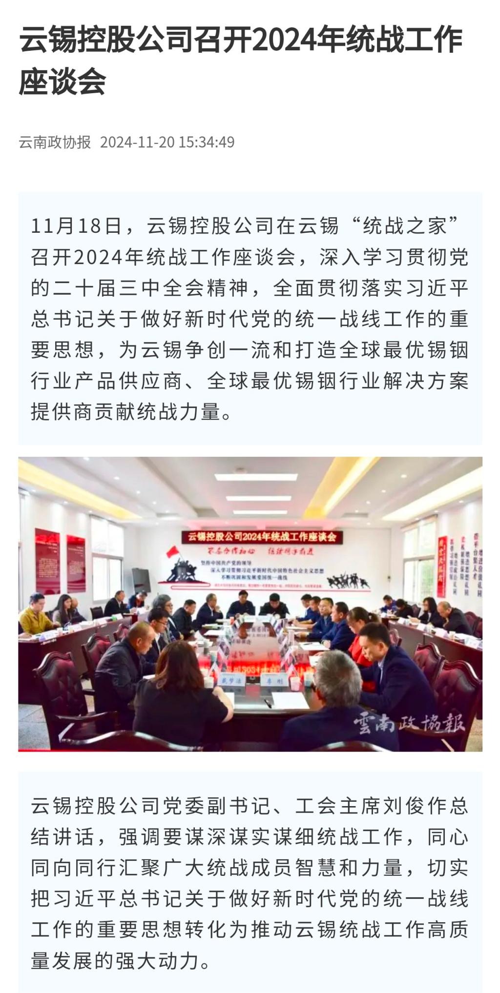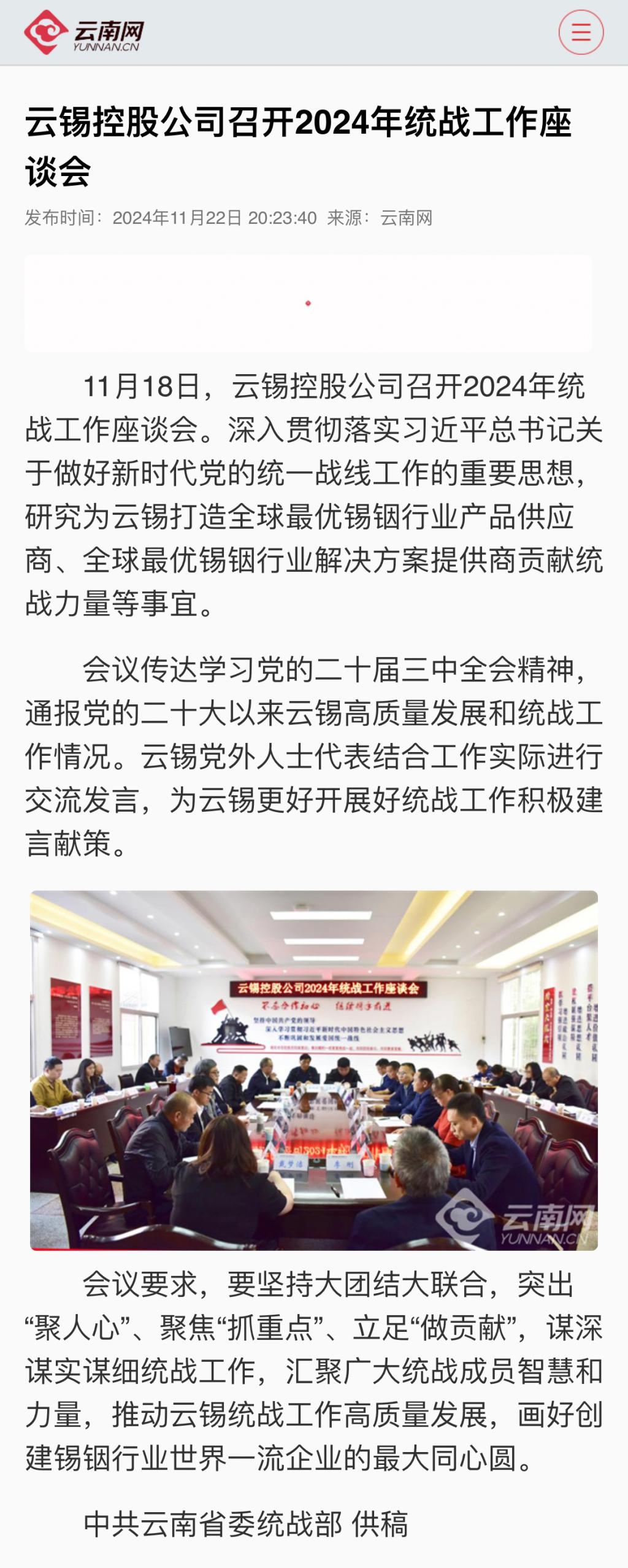 云南网、云南政协报、有色新闻:云锡控股公司召开2024年统战工作座谈会