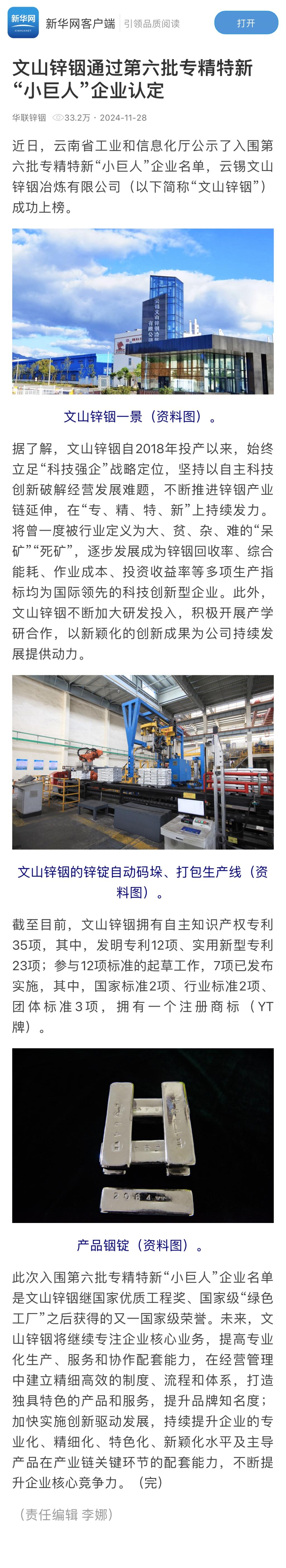 新华网:文山锌铟通过第六批专精特新“小巨人”企业认定