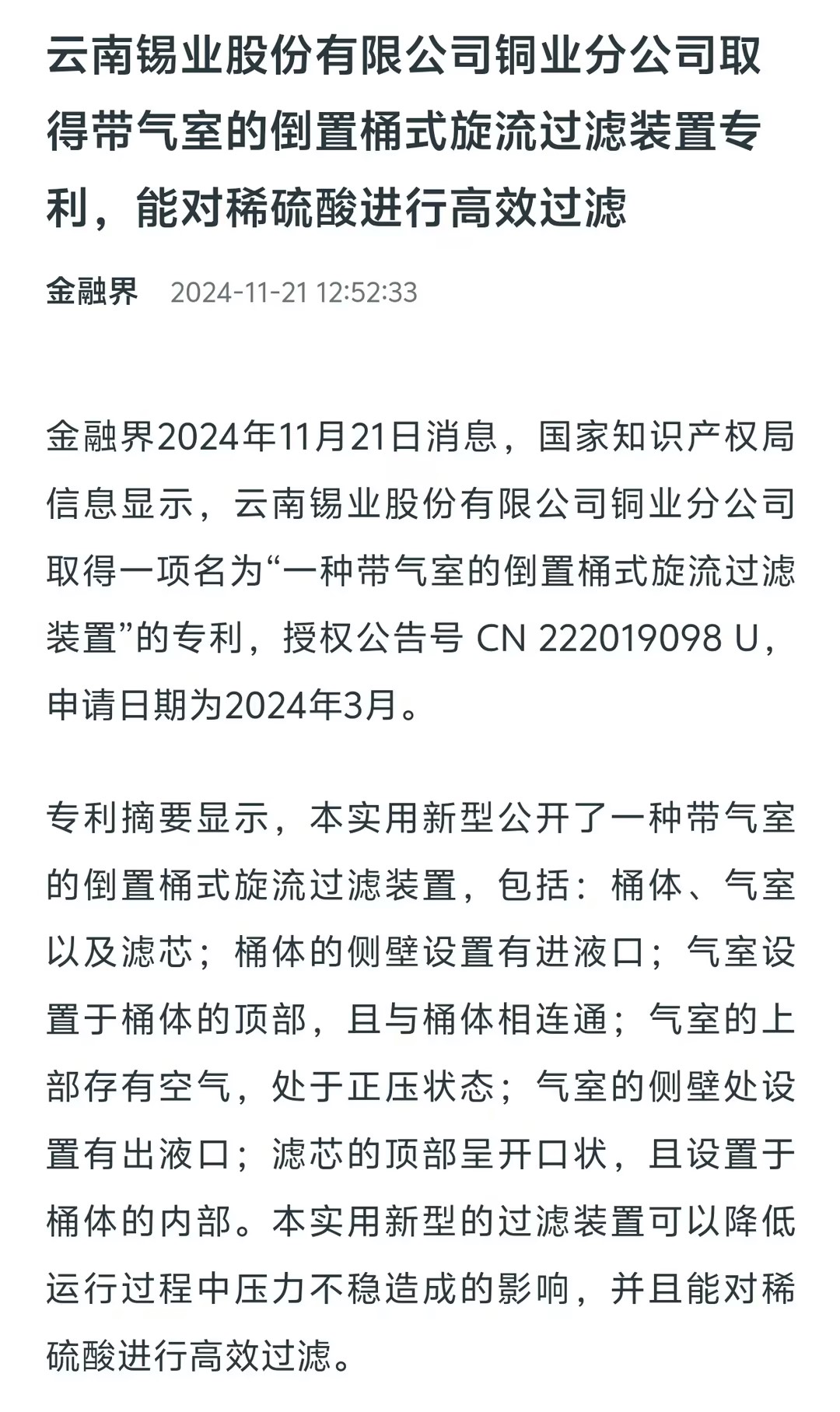 云南锡业股份有限公司铜业分公司取得带气室的倒置桶式旋流过滤装置专利,能对稀硫酸进行高效过滤