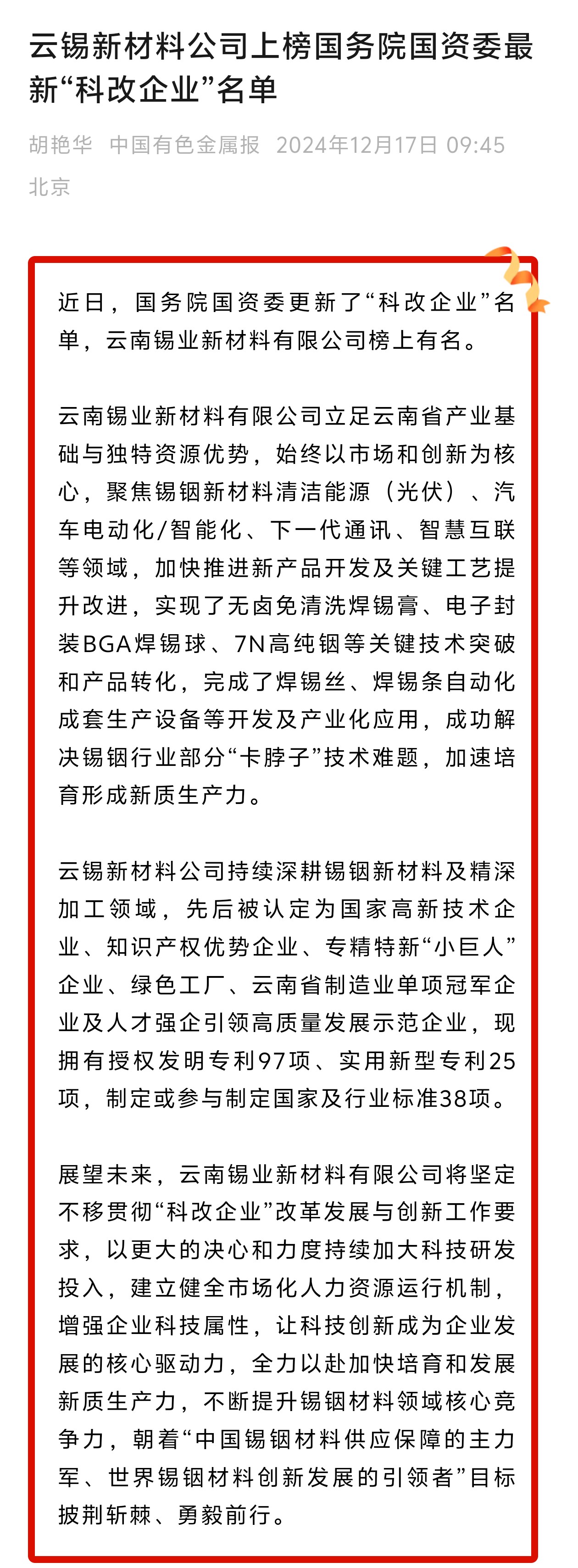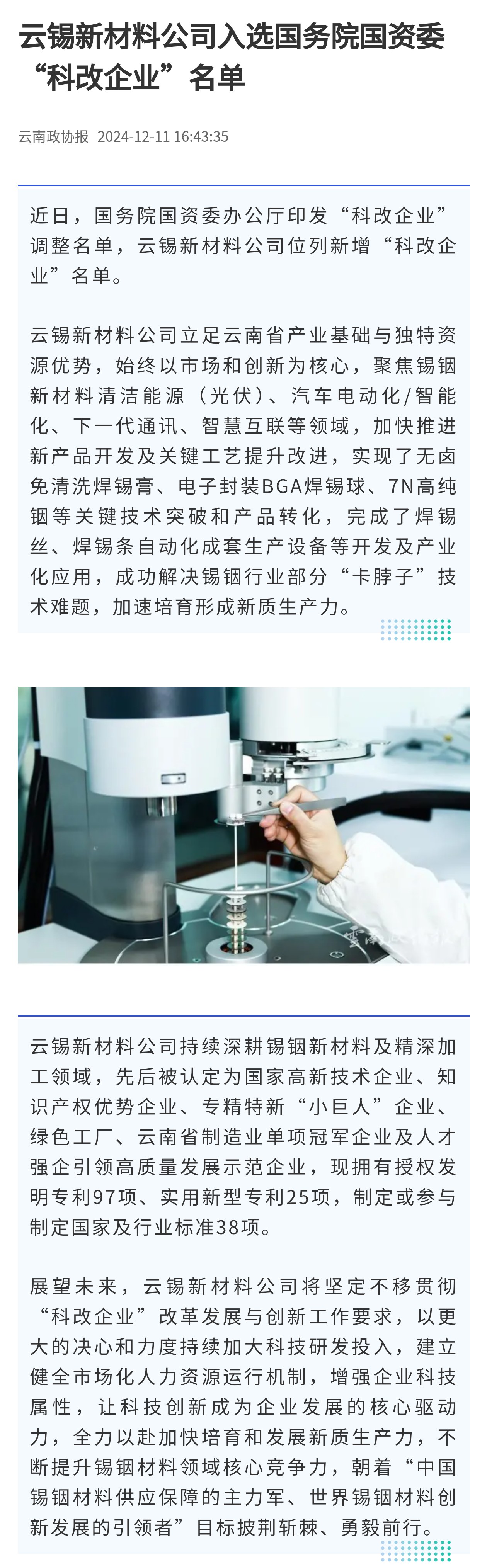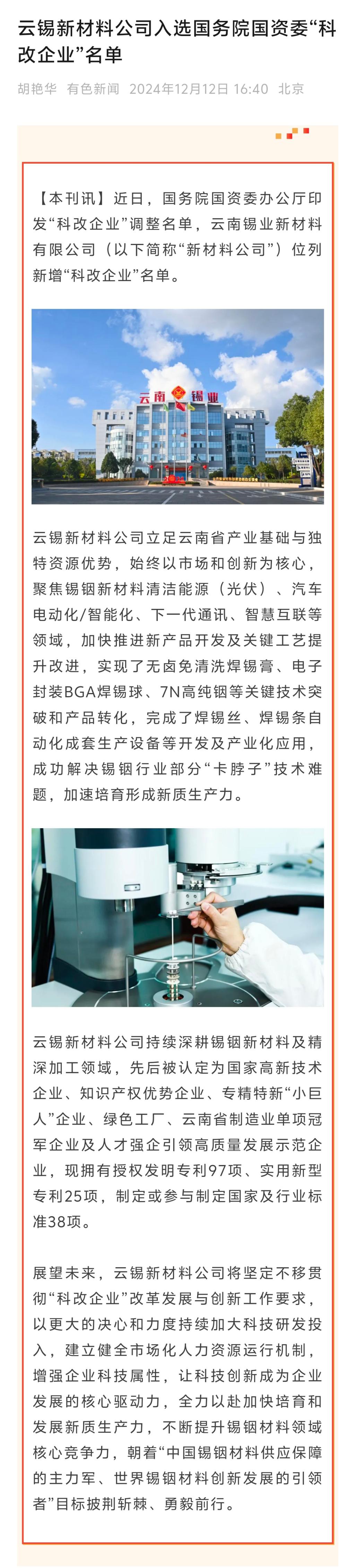 云南政协报、中国有色金属报、有色新闻:新材料公司入选国务院国资委“科改企业”名单