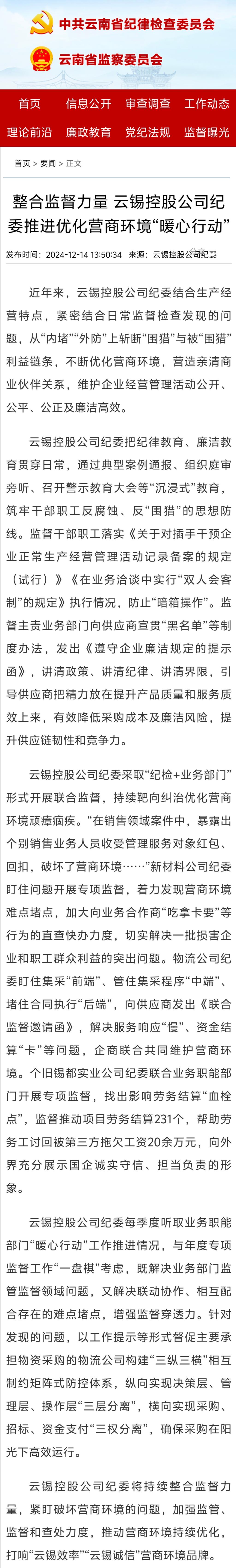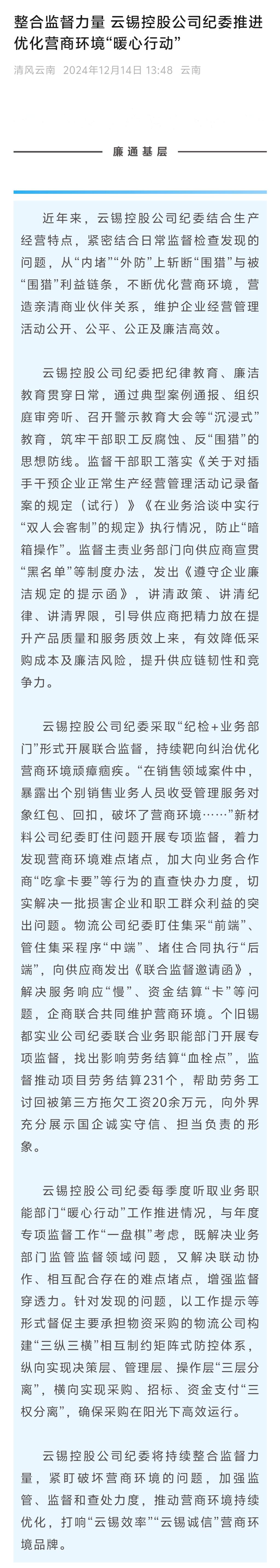 省纪委监委、清风云南:整合监督力量 云锡纪委推进优化营商环境“暖心行动”