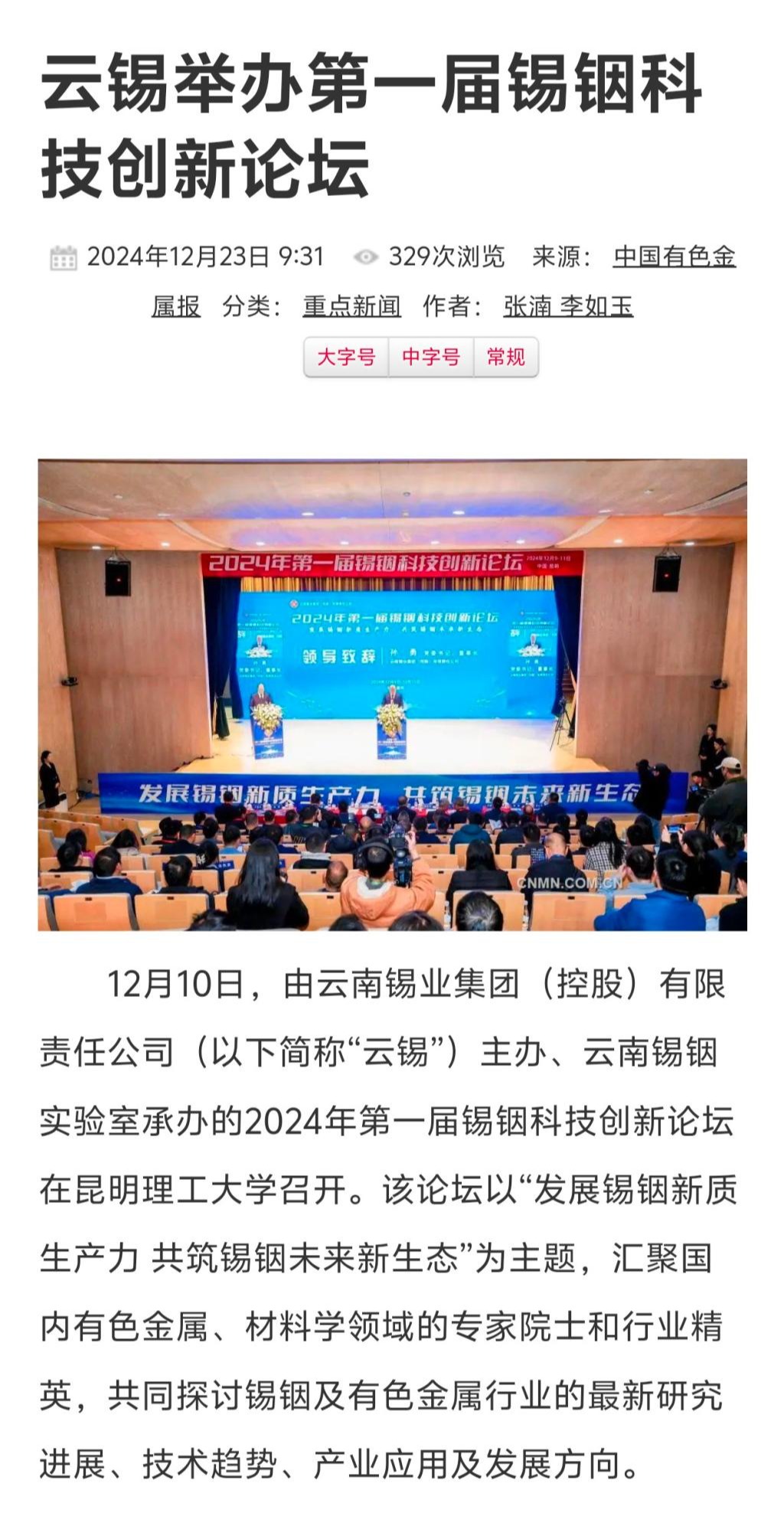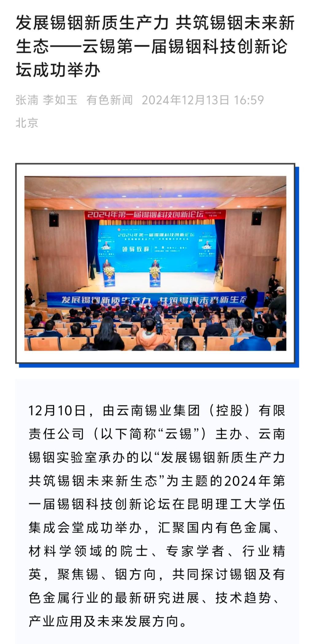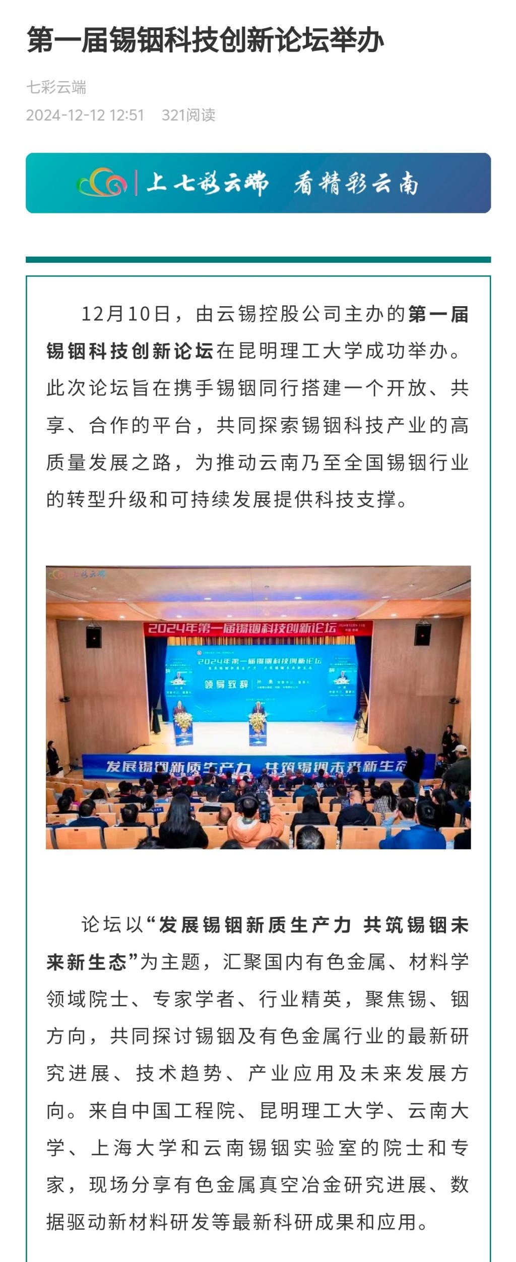 云南新闻联播、七彩云端、中国有色金属报、有色新闻:发展新质生产力 第一届锡铟科技创新论坛举办