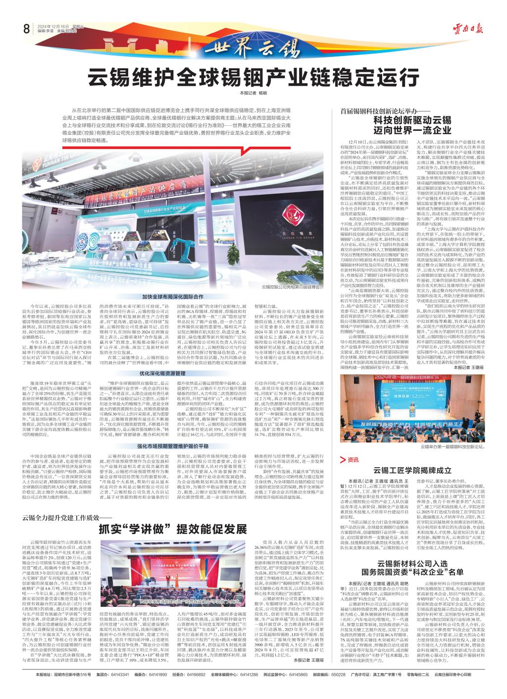 “云南是锡铟资源大省,云锡控股公司作为全球锡铟行业‘双龙头’企业和百年国企,始终坚持‘以科技创新之力、扬产业报国之志’。”云锡控股公司党委书记、董事长孙勇表示,科技创新是培育新质生产力的核心要素,云锡控股公司推进锡铟采选、冶炼、新材料三大领域产学研用融合,全力打造世界一流的锡铟产业链。
