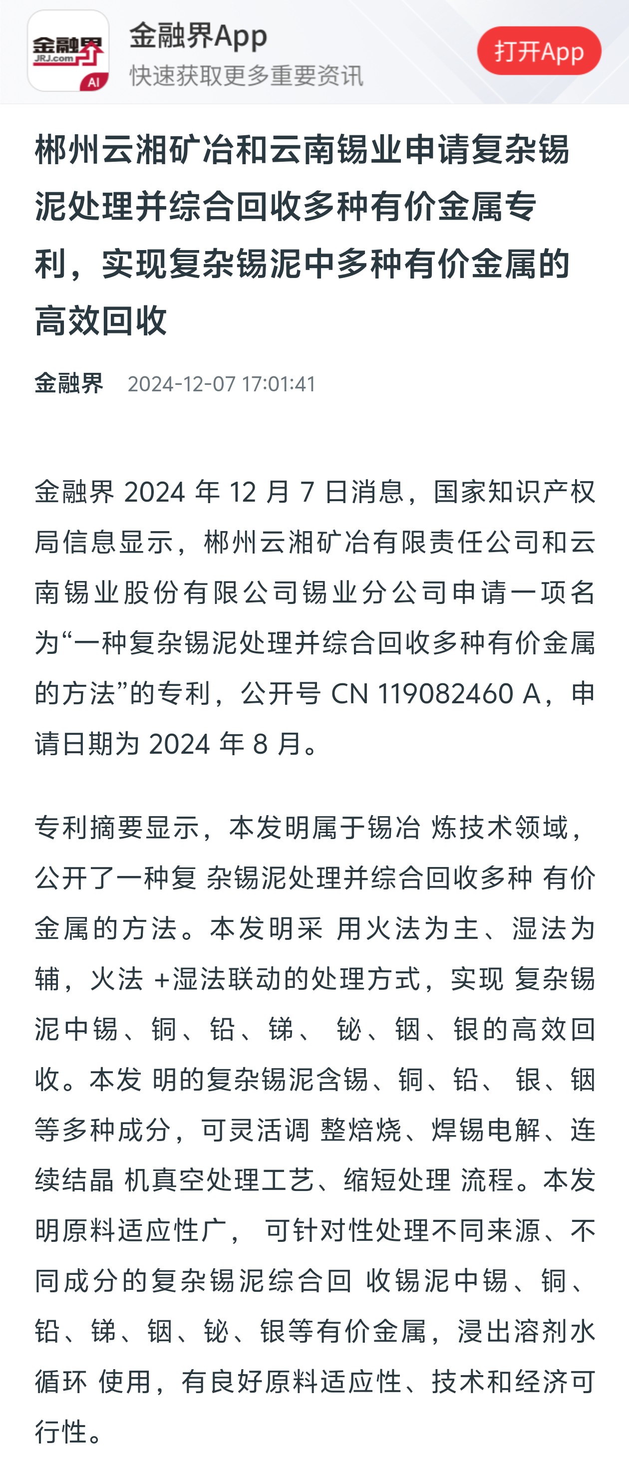 金融界:郴州云湘矿冶和云南锡业申请复杂锡泥处理并综合回收多种有价金属专利,实现复杂锡泥中多种有价金属的高效回收