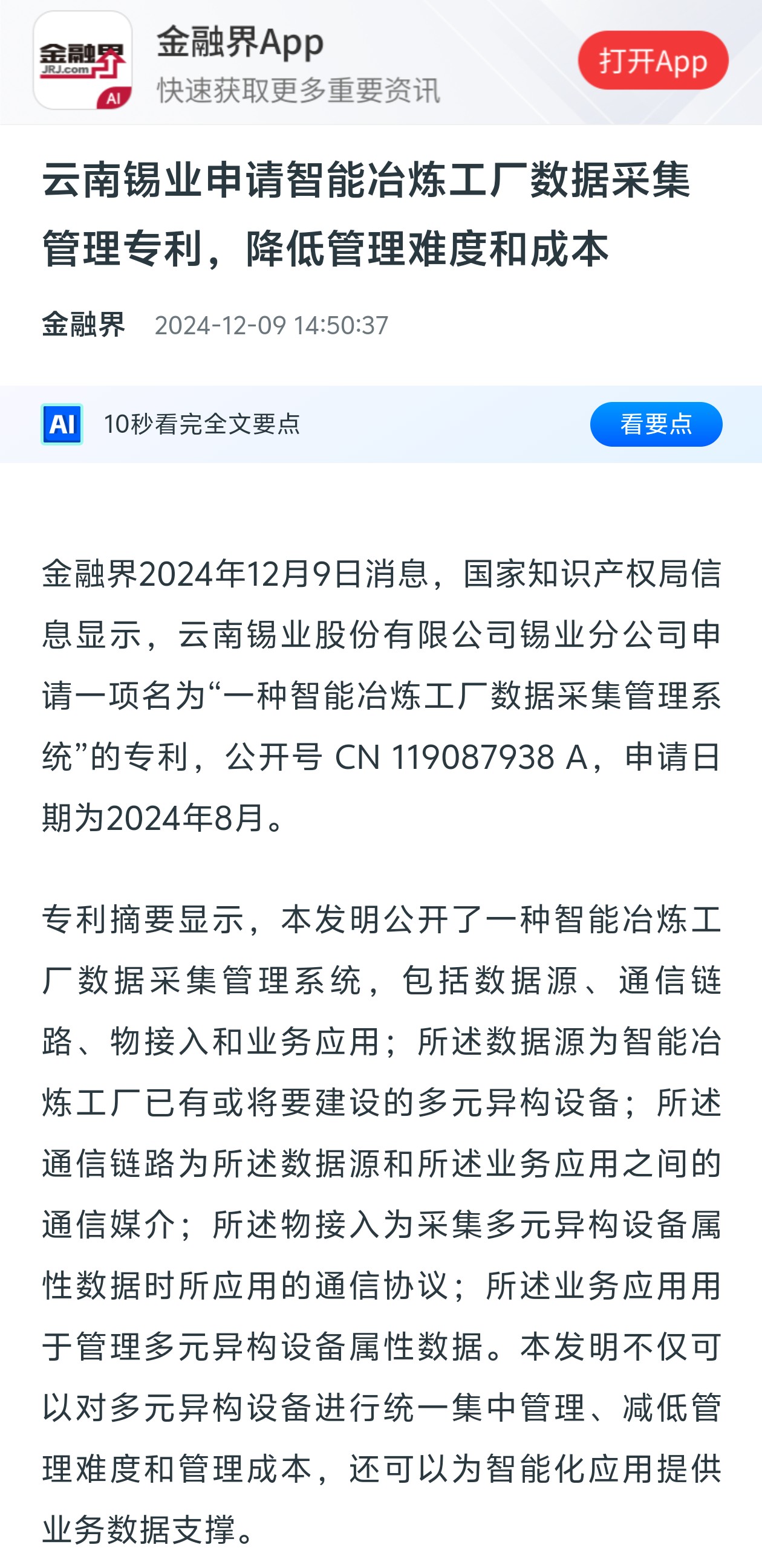 金融界:云南锡业申请智能冶炼工厂数据采集管理专利,降低管理难度和成本