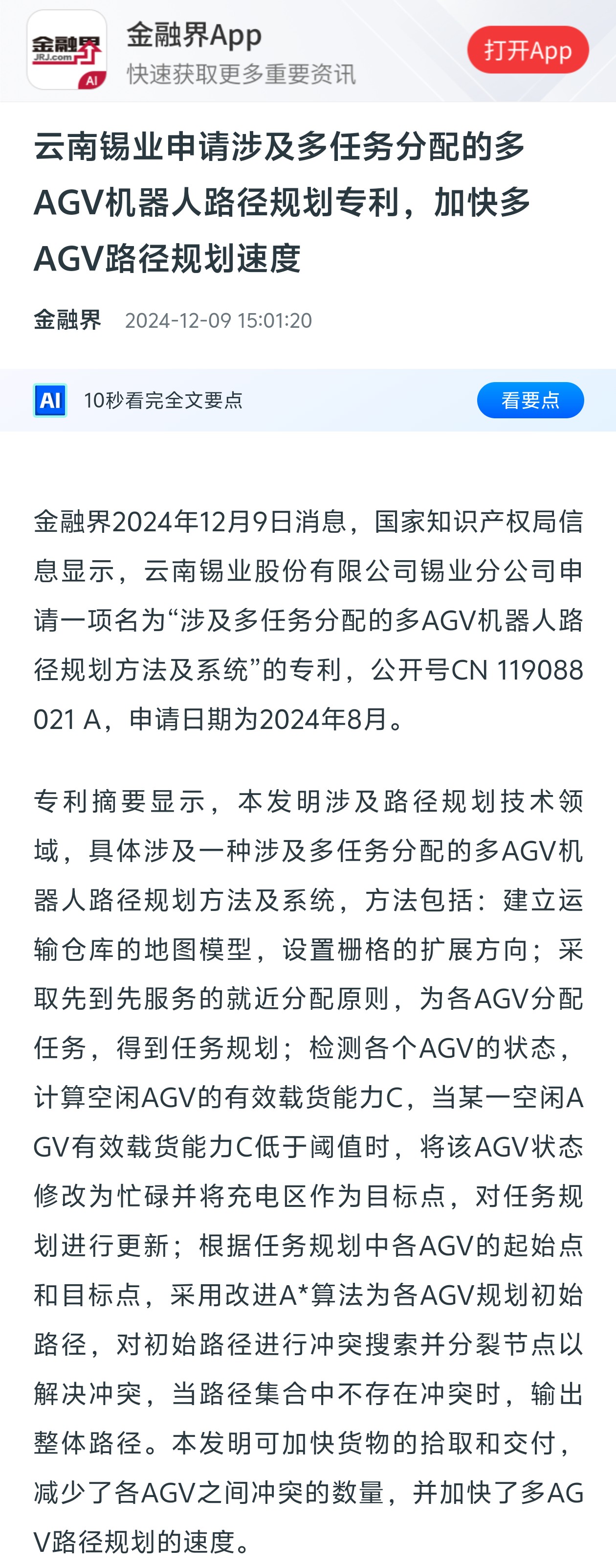 金融界:云南锡业申请涉及多任务分配的多AGV机器人路径规划专利,加快多AGV路径规划速度