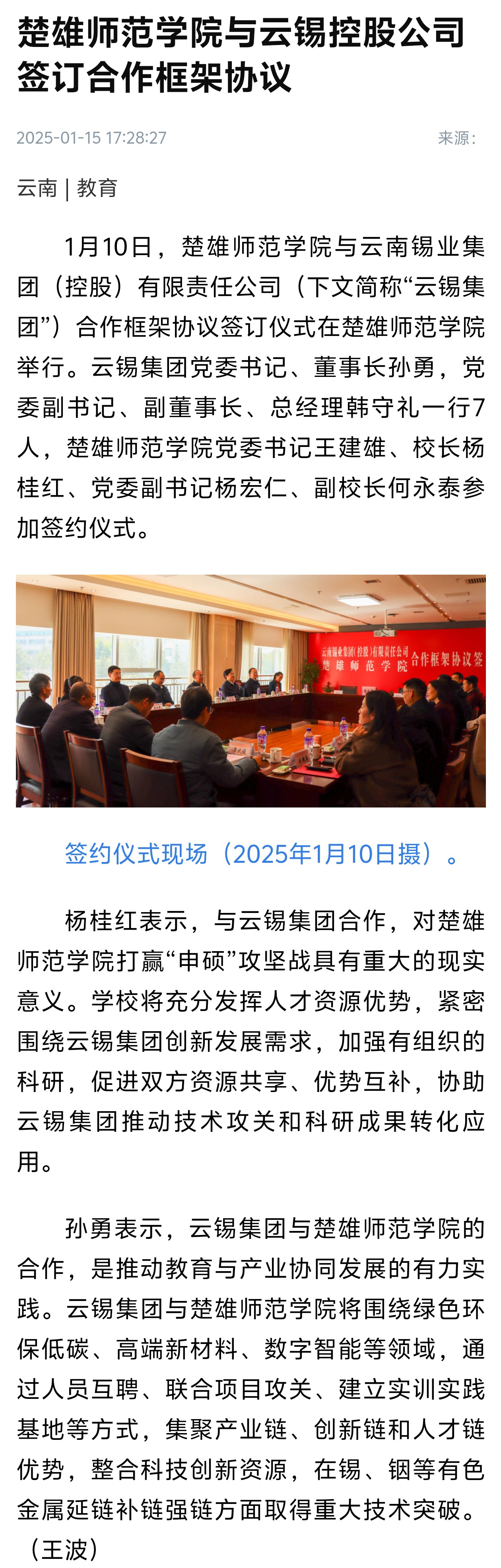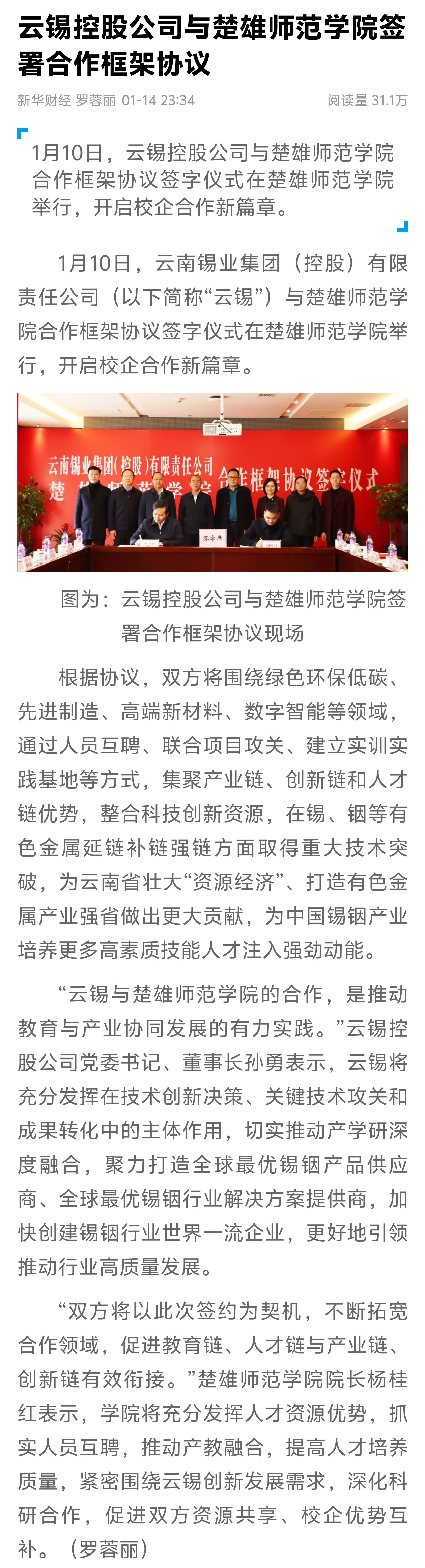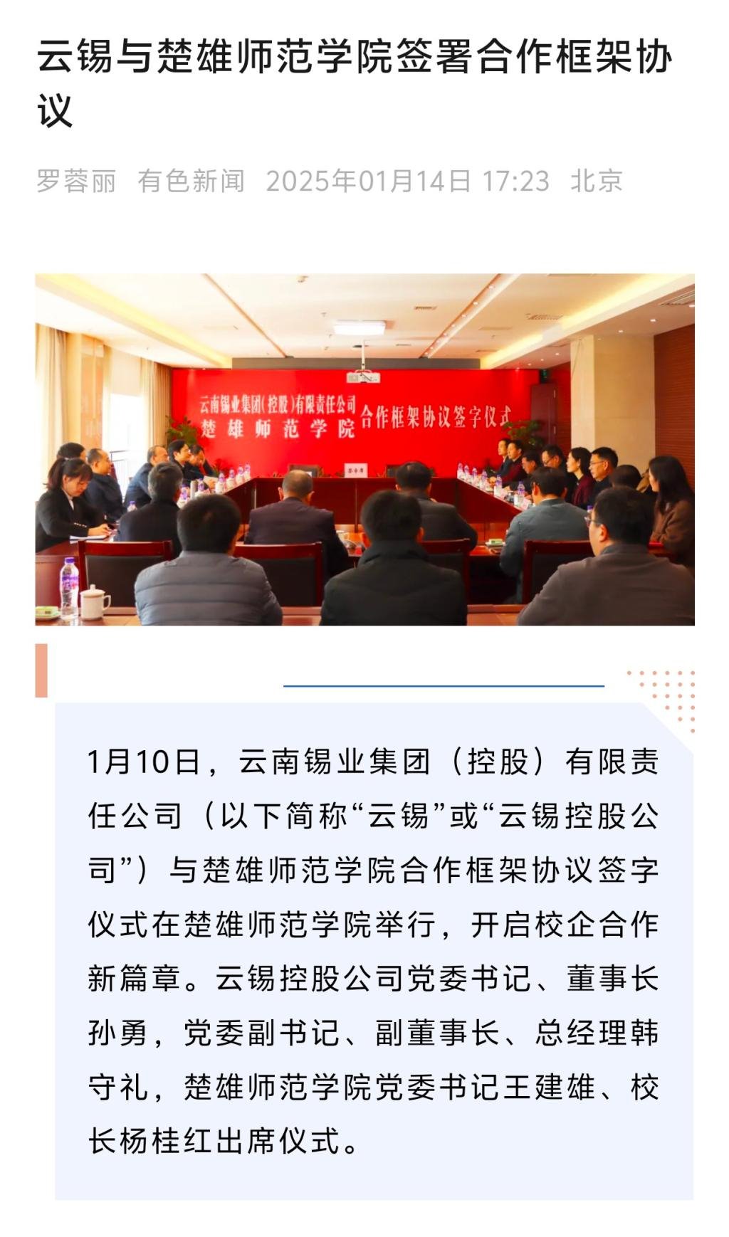 新华社、新华财经、云南政协报、有色新闻:云锡控股公司与楚雄师范学院签署合作框架协议