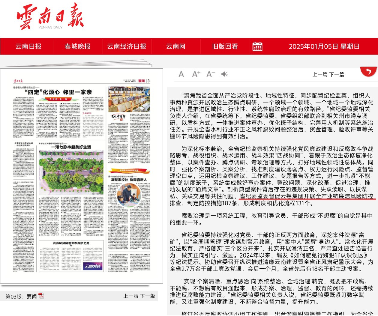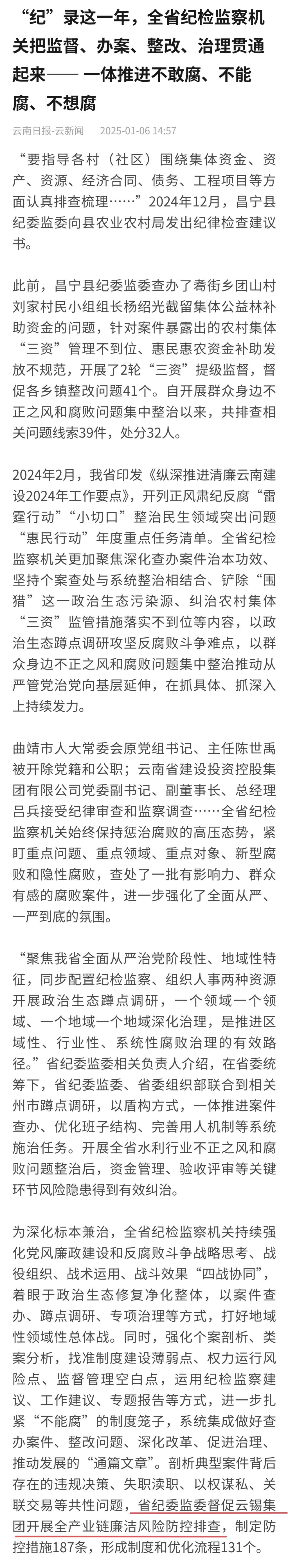 云南日报、云新闻、云南网:“纪”录这一年,全省纪检监察机关把监督、办案、整改、治理贯通起来——一体推进不敢腐、不能腐、不想腐