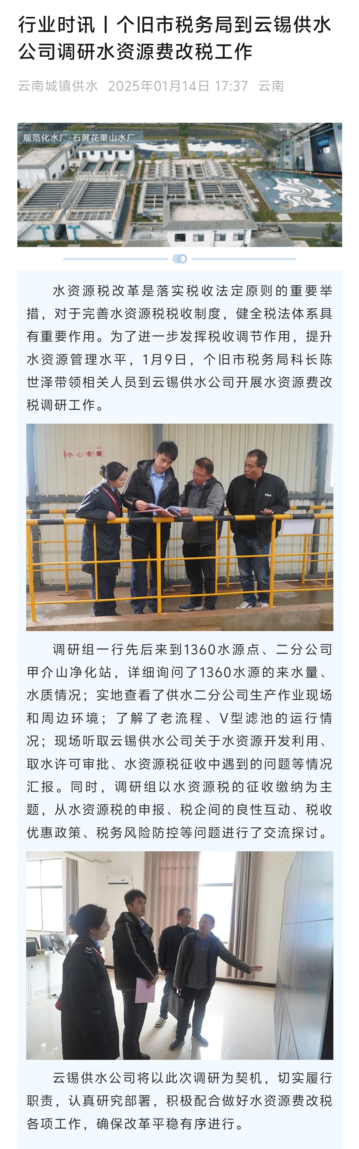 云南城镇供水:个旧市税务局到云锡供水公司调研水资源费改税工作