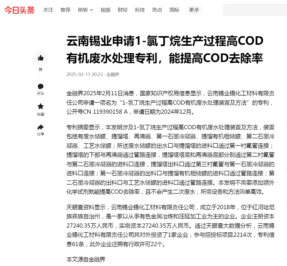 今日头条:云南锡业申请1-氯丁烷生产过程高COD有机废水处理专利,能提高COD去除率