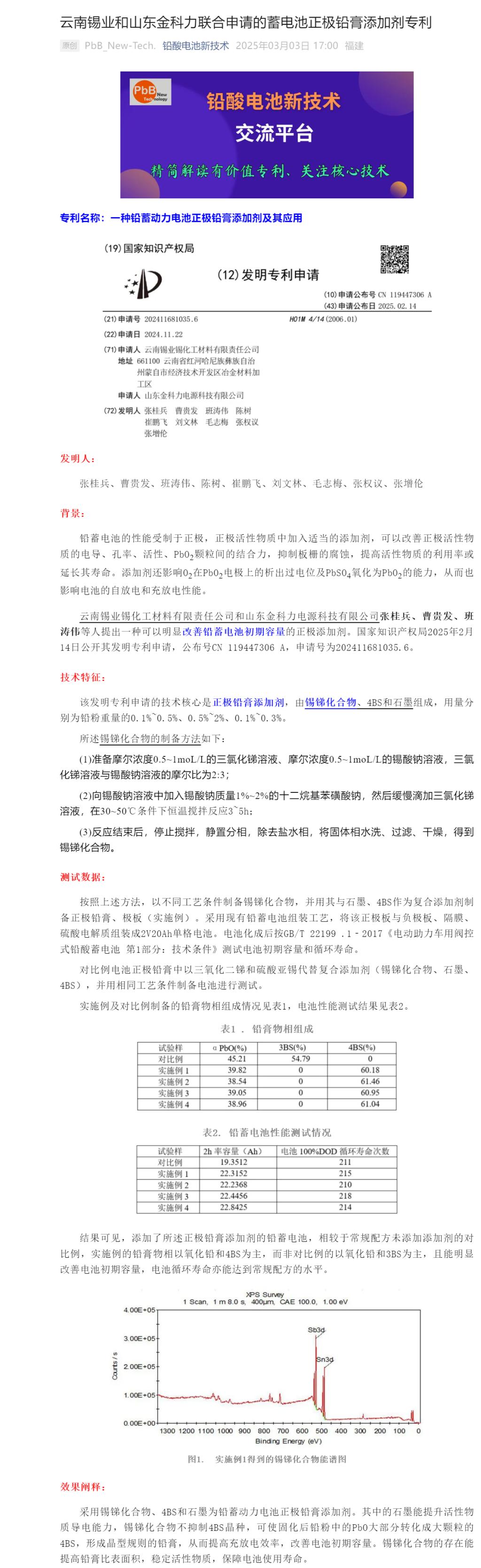 铅酸电池新技术:云南锡业和山东金科力联合申请的蓄电池正极铅膏添加剂专利