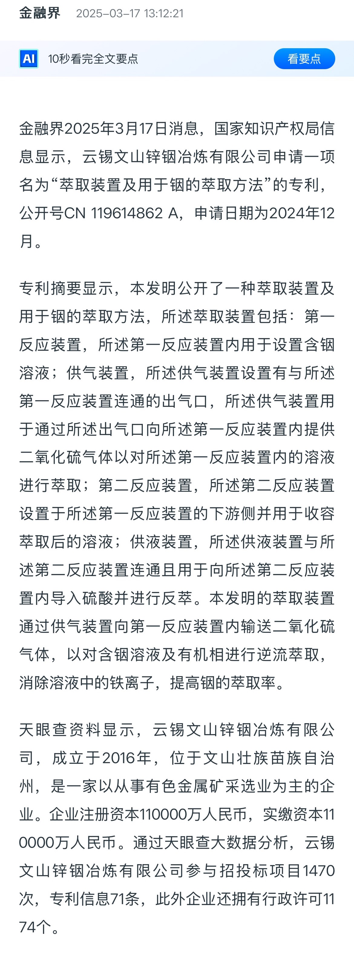金融界:云锡文山锌铟冶炼申请萃取装置及用于铟的萃取方法专利,提高铟的萃取率