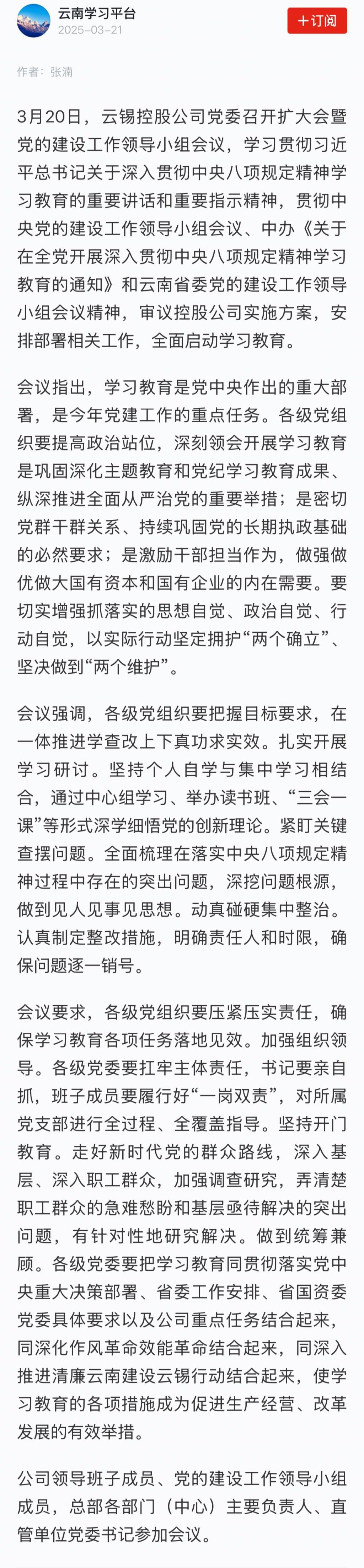 学习强国:云锡控股公司党委安排部署深入贯彻中央八项规定精神学习教育