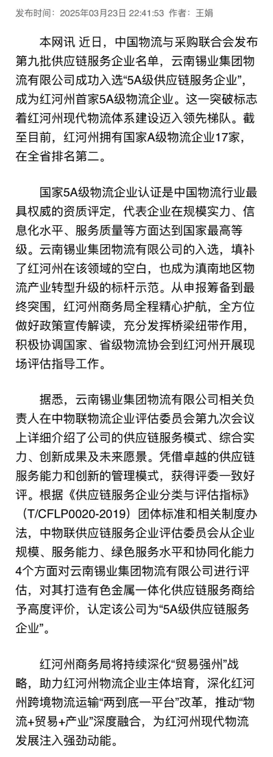 红河网:红河州首家5A级物流企业申报成功
