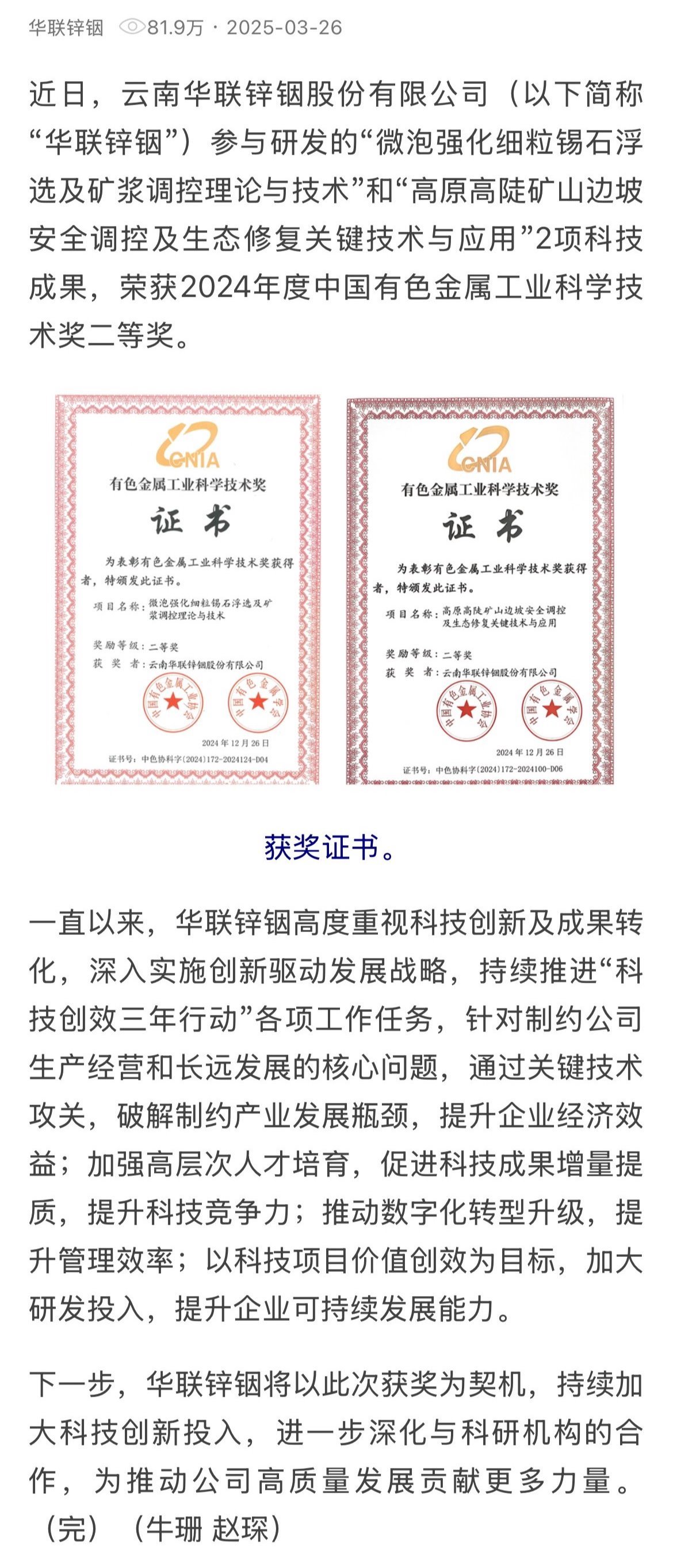 新华网:华联锌铟2项科技成果荣获2024年度中国有色金属工业科学技术奖二等奖