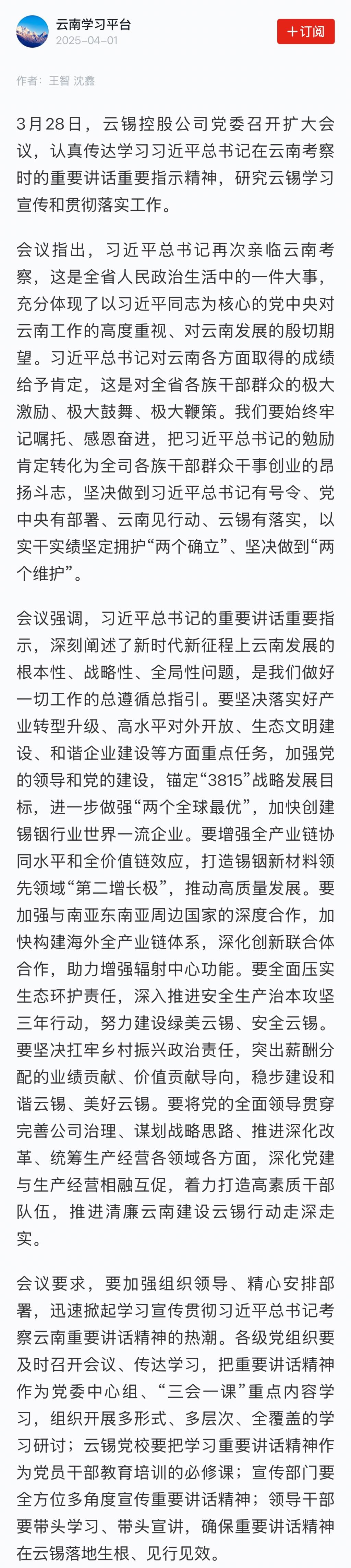 学习强国:云锡控股公司党委召开扩大会议 认真传达学习习近平总书记考察云南重要讲话重要指示精神
