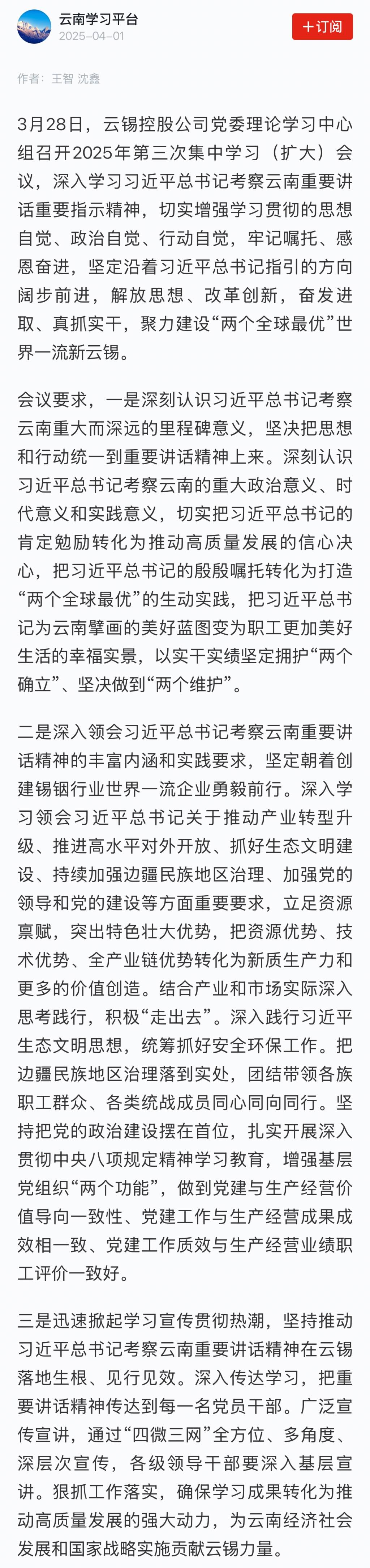 学习强国:云锡控股公司党委理论学习中心组专题学习习近平总书记考察云南重要讲话重要指示精神