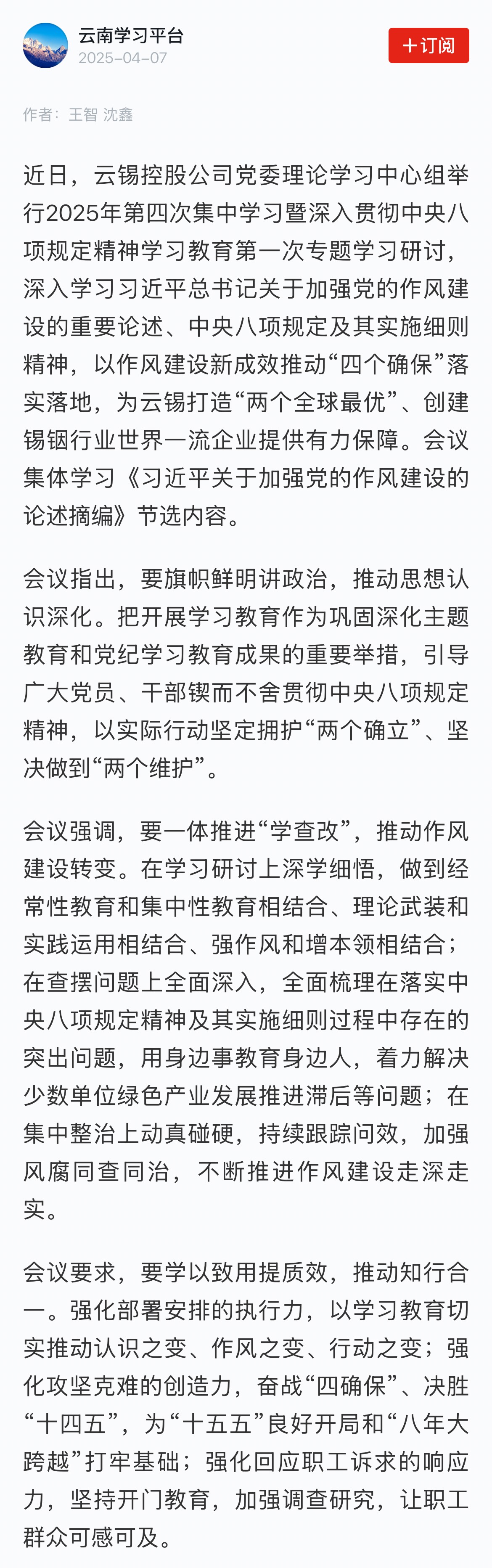 学习强国:云锡控股公司党委理论学习中心组举行深入贯彻中央八项规定精神学习教育第一次专题学习研讨