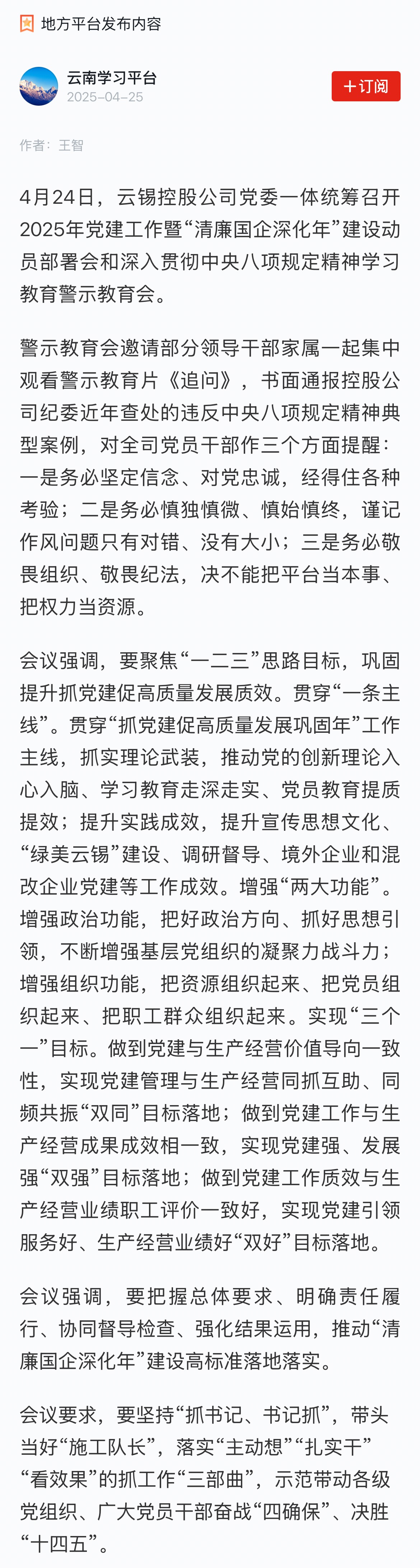学习强国:云锡控股公司党委召开2025年党建工作暨“清廉国企深化年”建设动员部署、警示教育会