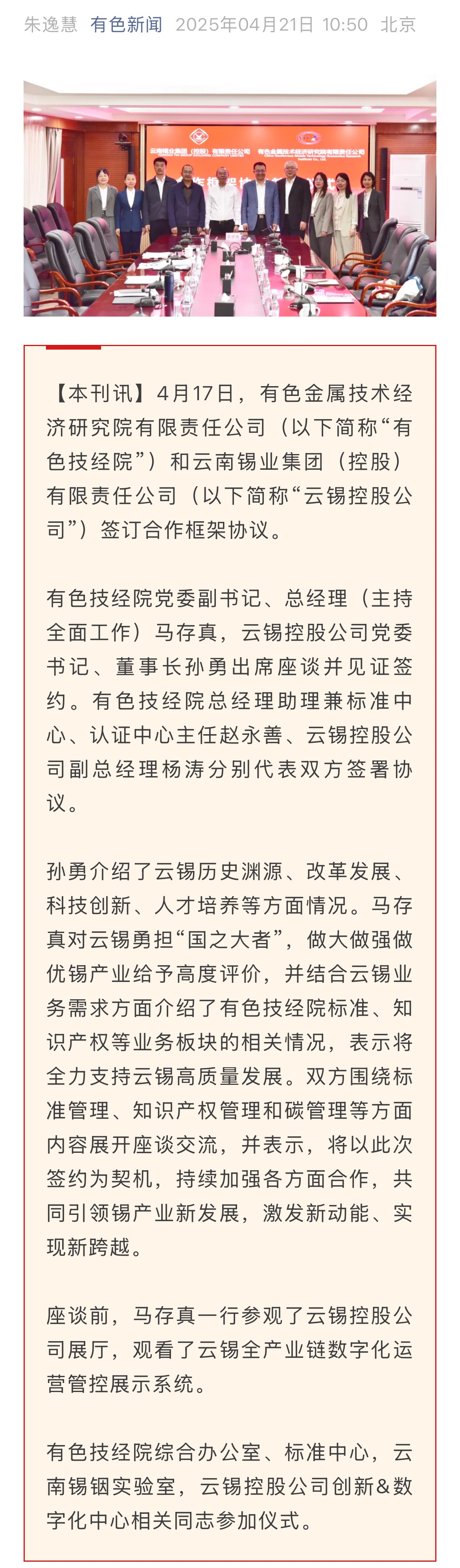 有色新闻:有色技经院与云锡控股公司签订合作框架协议