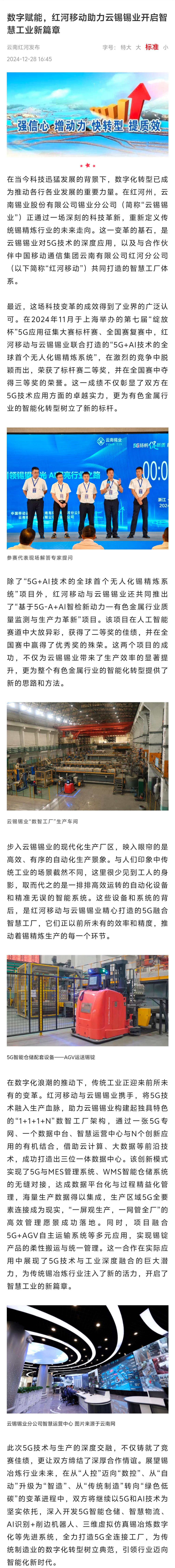 云南红河发布:数字赋能,红河移动助力云锡锡业开启智慧工业新篇章
