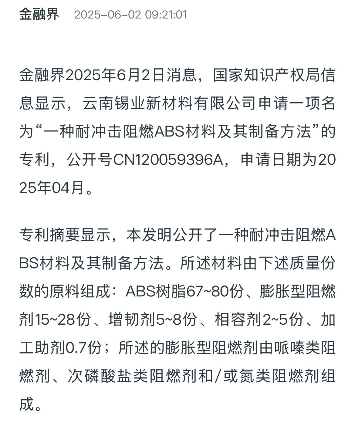 金融界:云南锡业新材料申请耐冲击阻燃ABS材料及其制备方法专利,具备优异的力学性能和阻燃性能