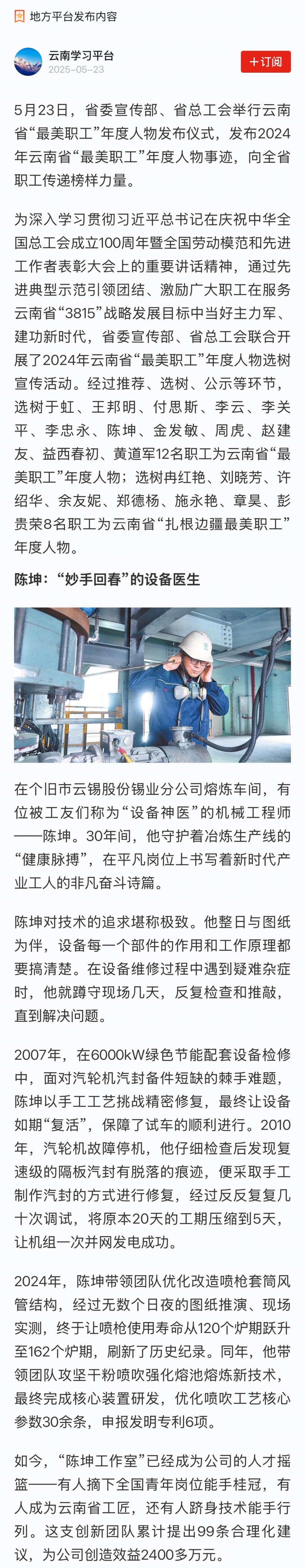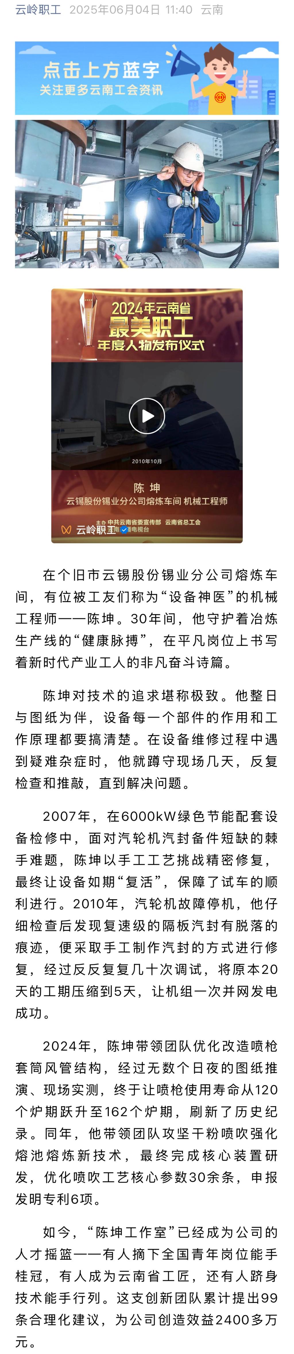学习强国、云南发布、七彩云端、云岭职工:2024年云南省最美职工年度人物——陈坤