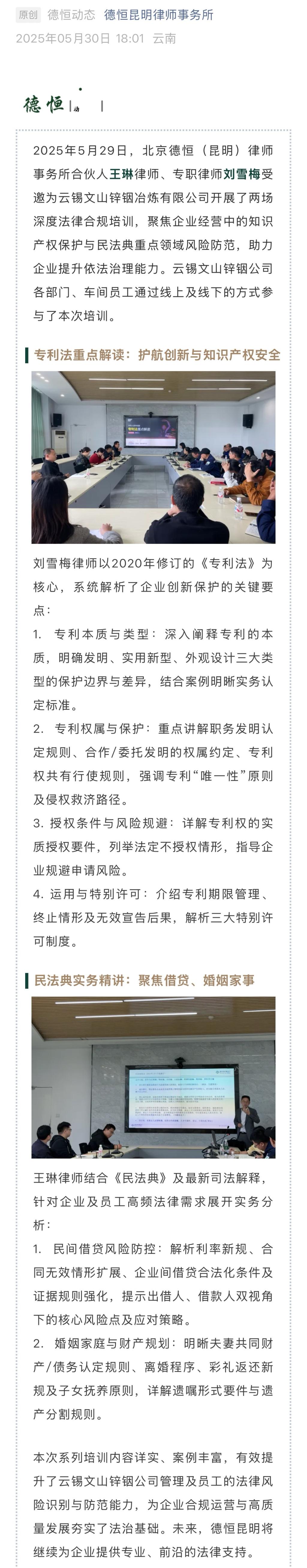 德恒动态:德恒昆明律师受邀为云锡文山锌铟冶炼有限公司 开展《民法典》及《专利法》培训