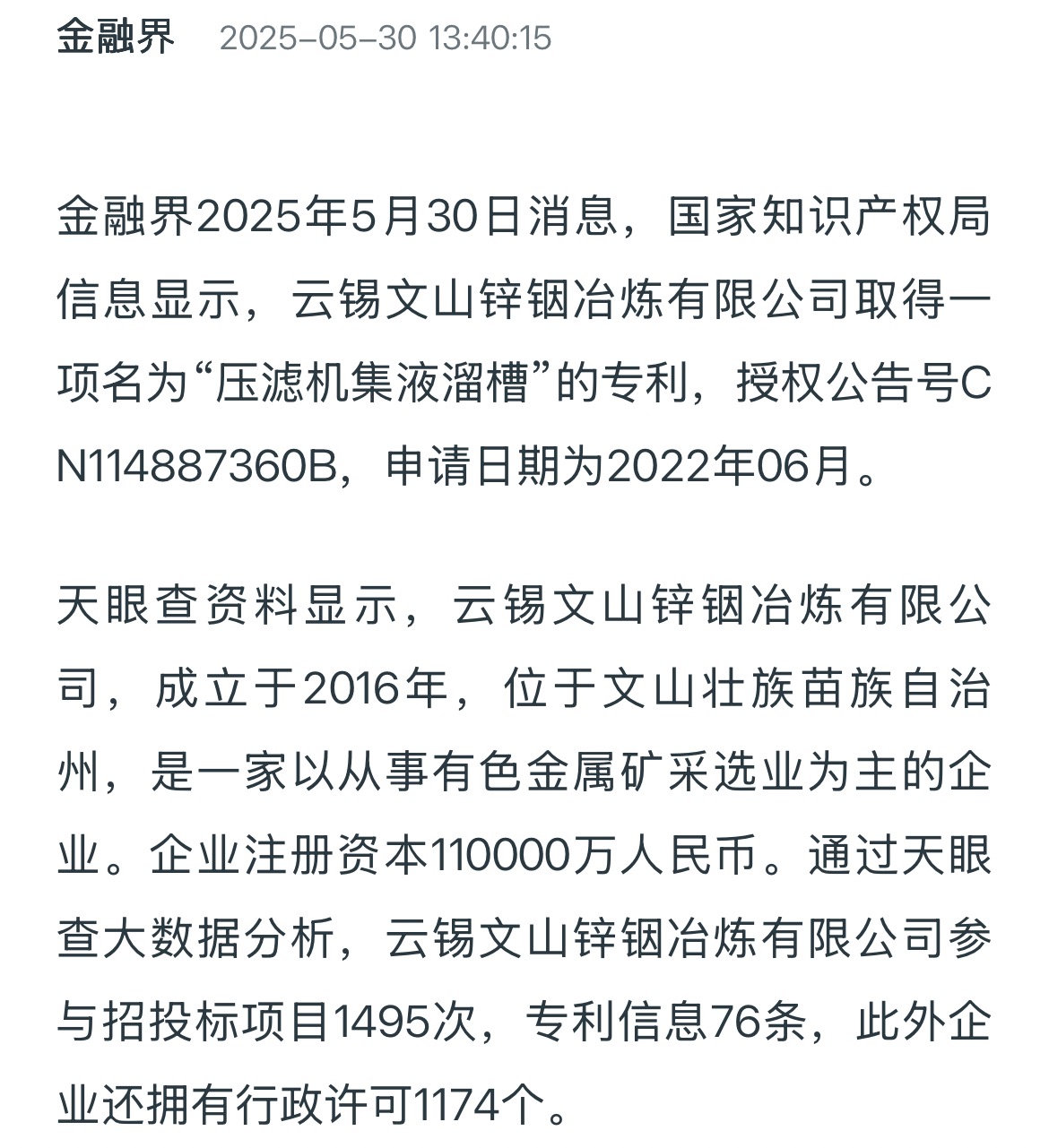 金融界:云锡文山锌铟冶炼取得压滤机集液溜槽专利