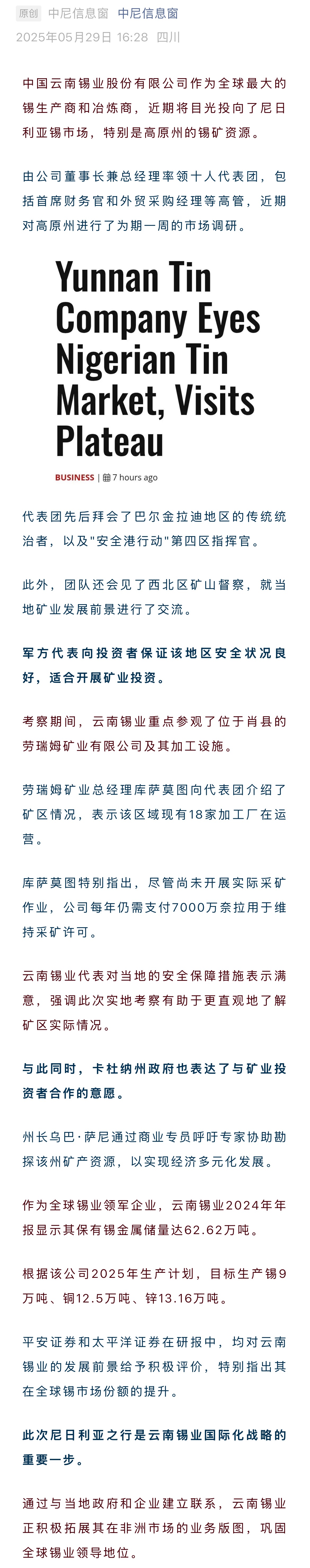 中尼信息窗:中国云南锡业集团实地考察尼日利亚高原州锡矿资源