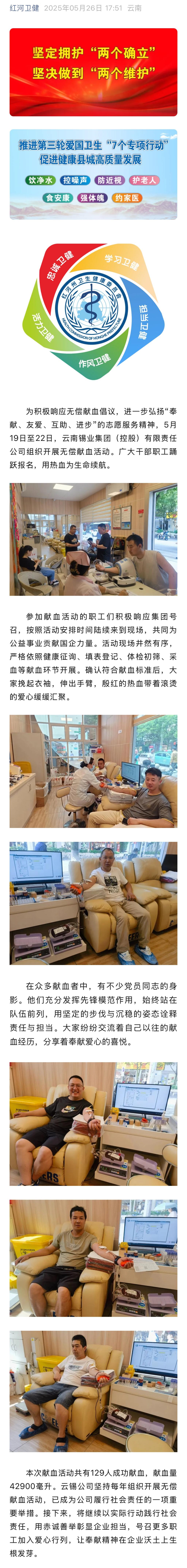 红河卫健:云南锡业集团(控股)有限责任公司组织开展无偿献血活动