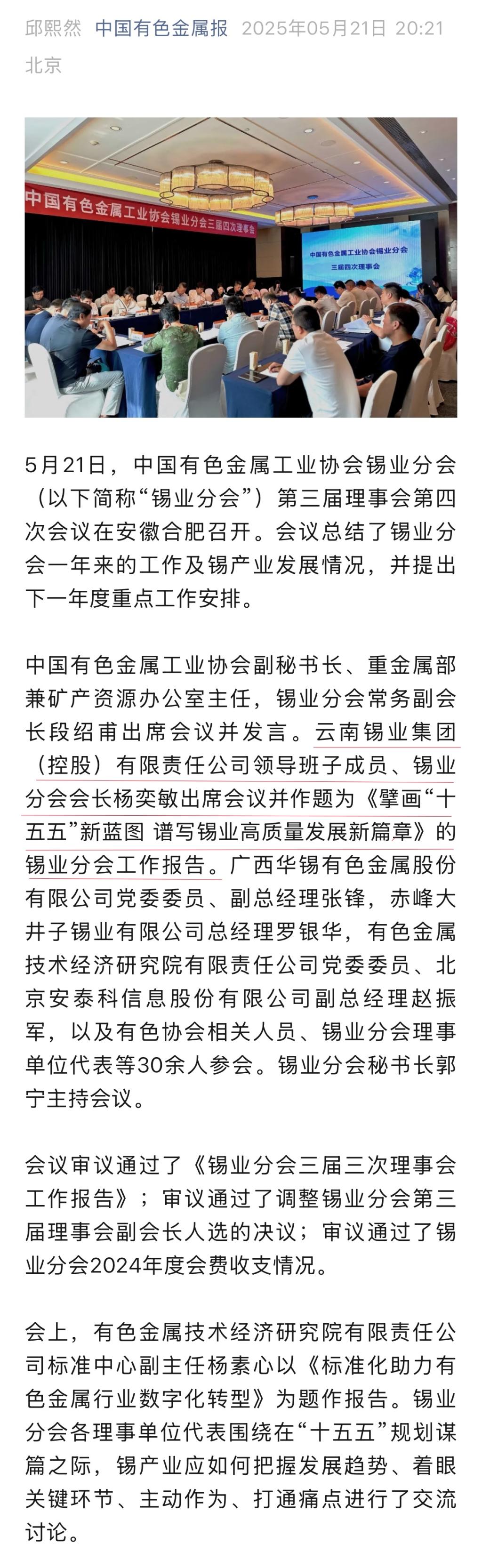 中国有色金属报:有色协会锡业分会第三届理事会第四次会议召开