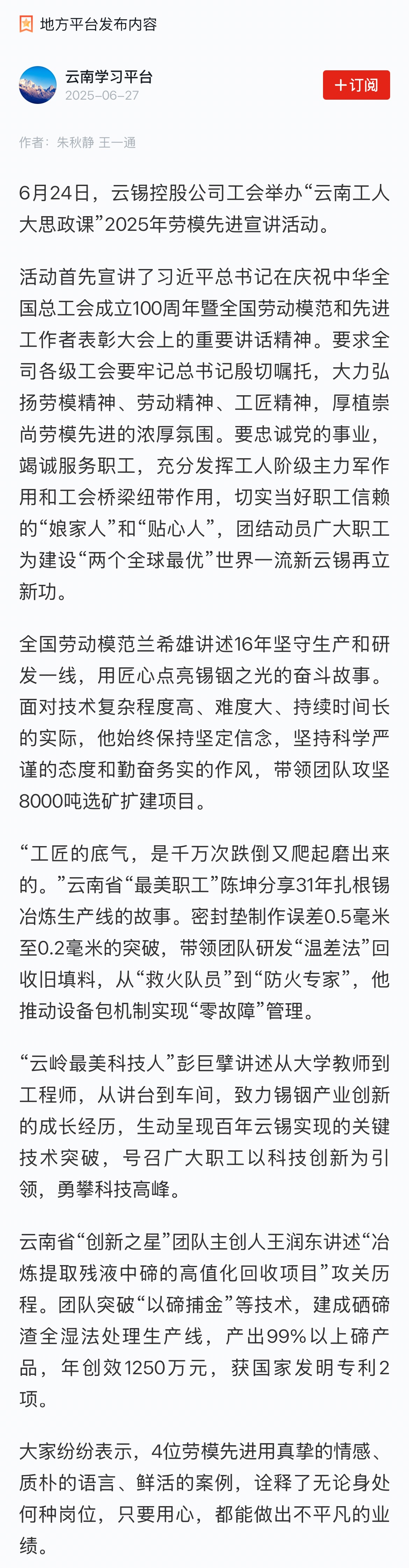 学习强国:云锡控股公司工会举办“云南工人大思政课”2025年劳模先进宣讲活动