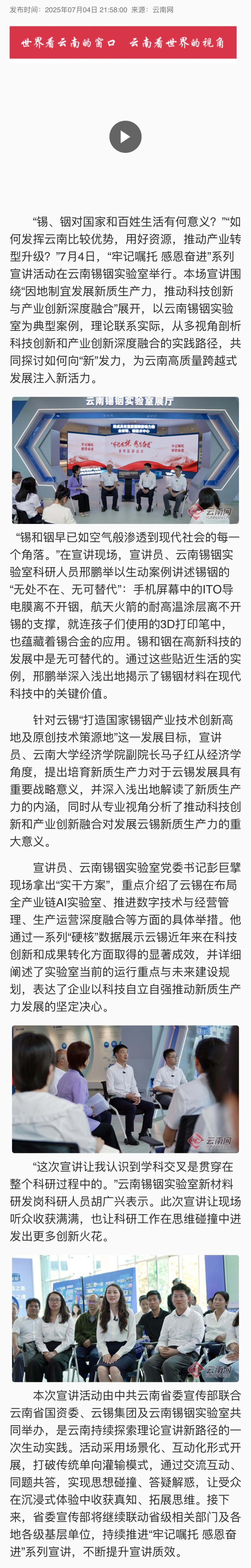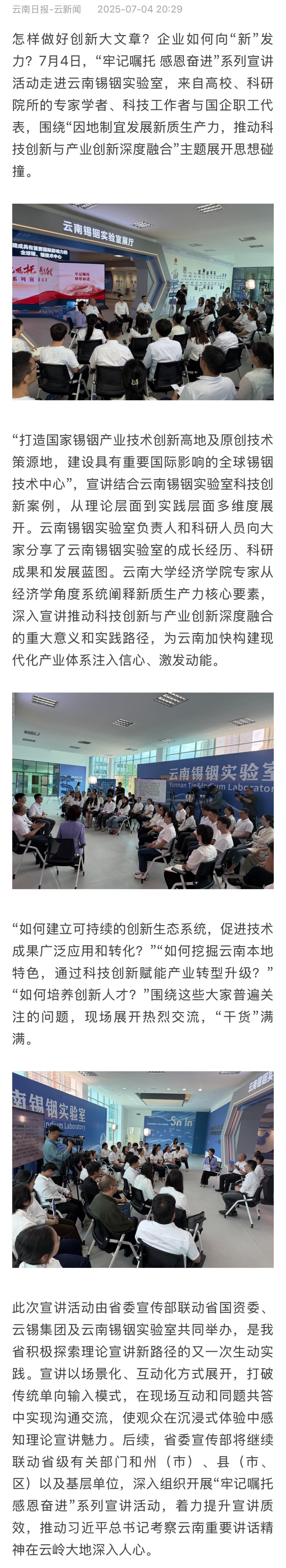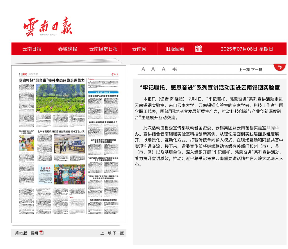 云南卫视、云南日报、云南网:“牢记嘱托 感恩奋进”系列宣讲活动走进锡铟实验室