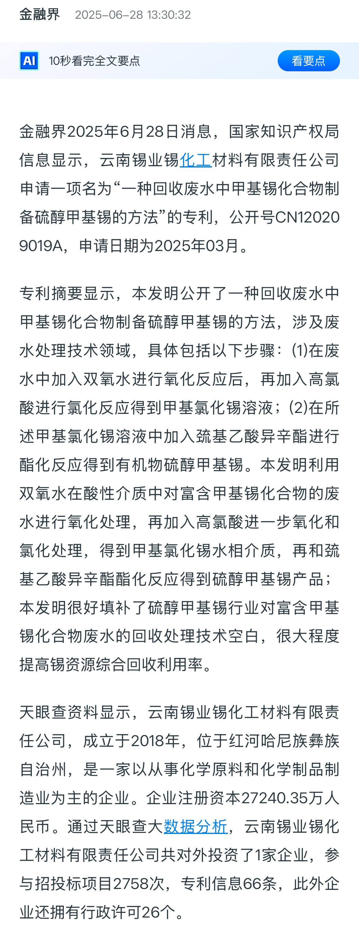 金融界:云南锡业申请回收废水中甲基锡化合物制备硫醇甲基锡专利,填补硫醇甲基锡行业对富含甲基锡化合物废水的回收处理技术空白