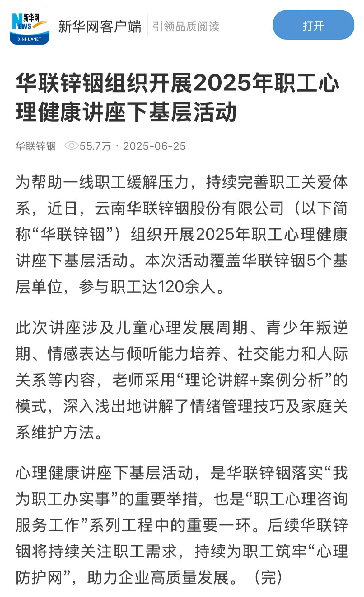 新华网:华联锌铟组织开展2025年职工心理健康讲座下基层活动