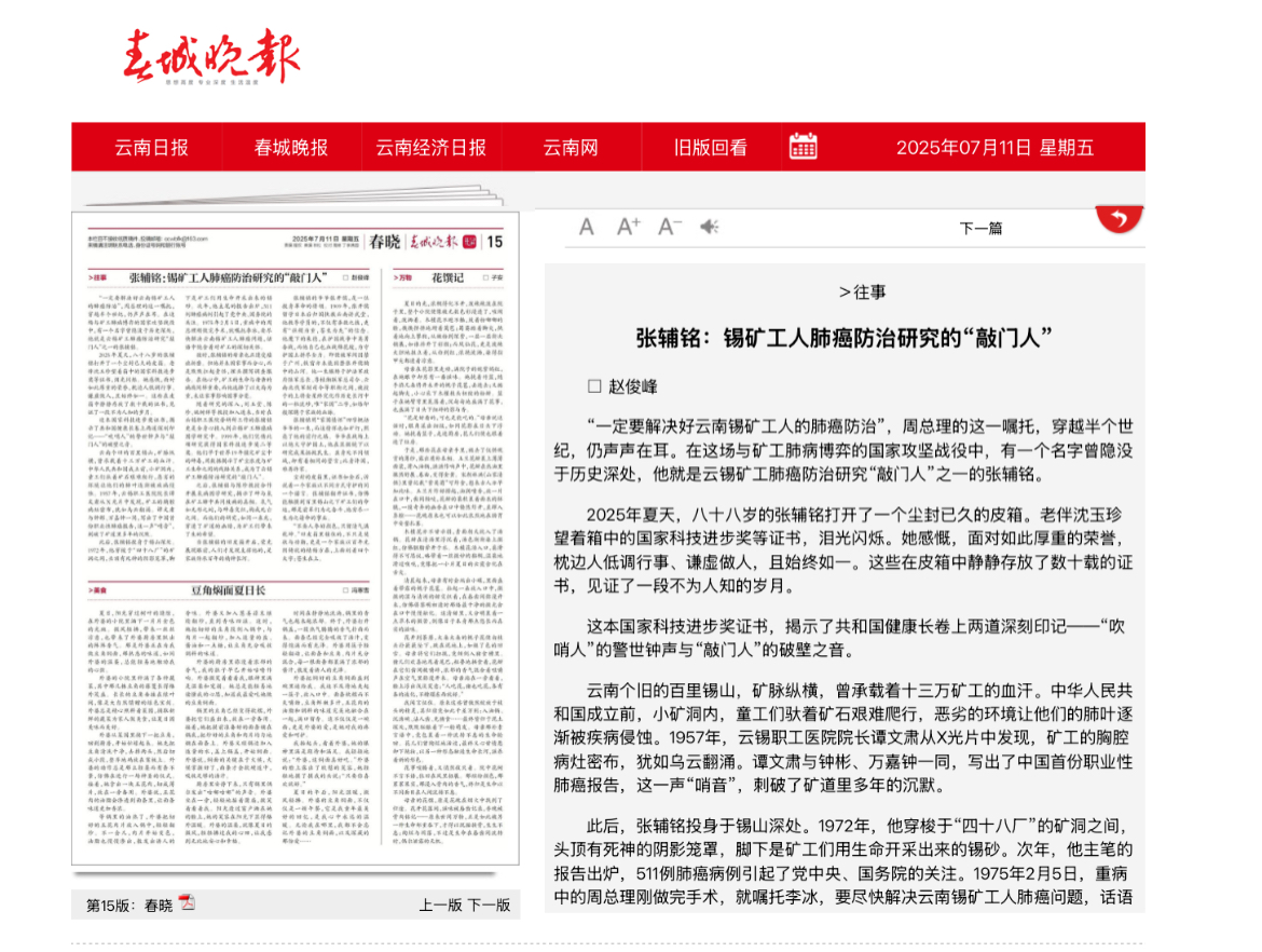 春城晚报:张辅铭——锡矿工人肺癌防治研究的“敲门人”