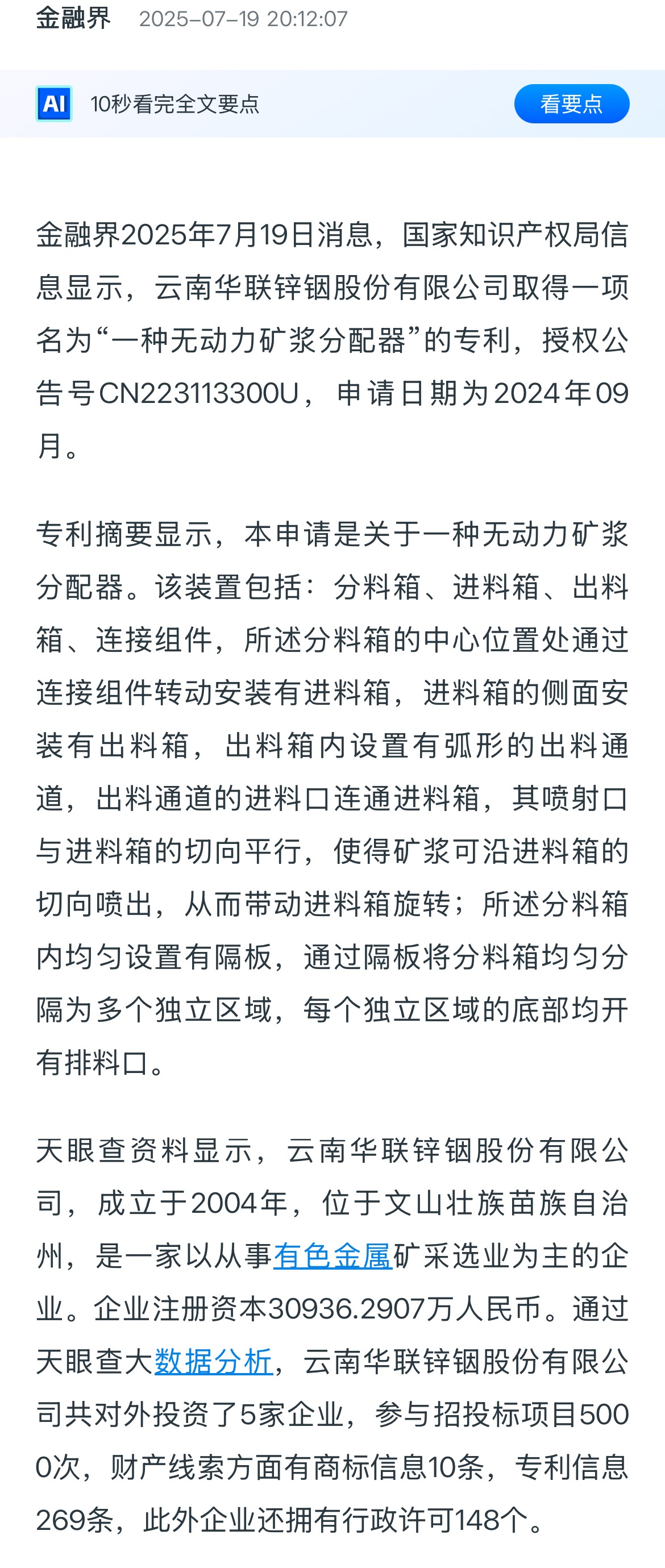 金融界:云南华联锌铟取得无动力矿浆分配器专利,保证矿浆分配器的正常运行