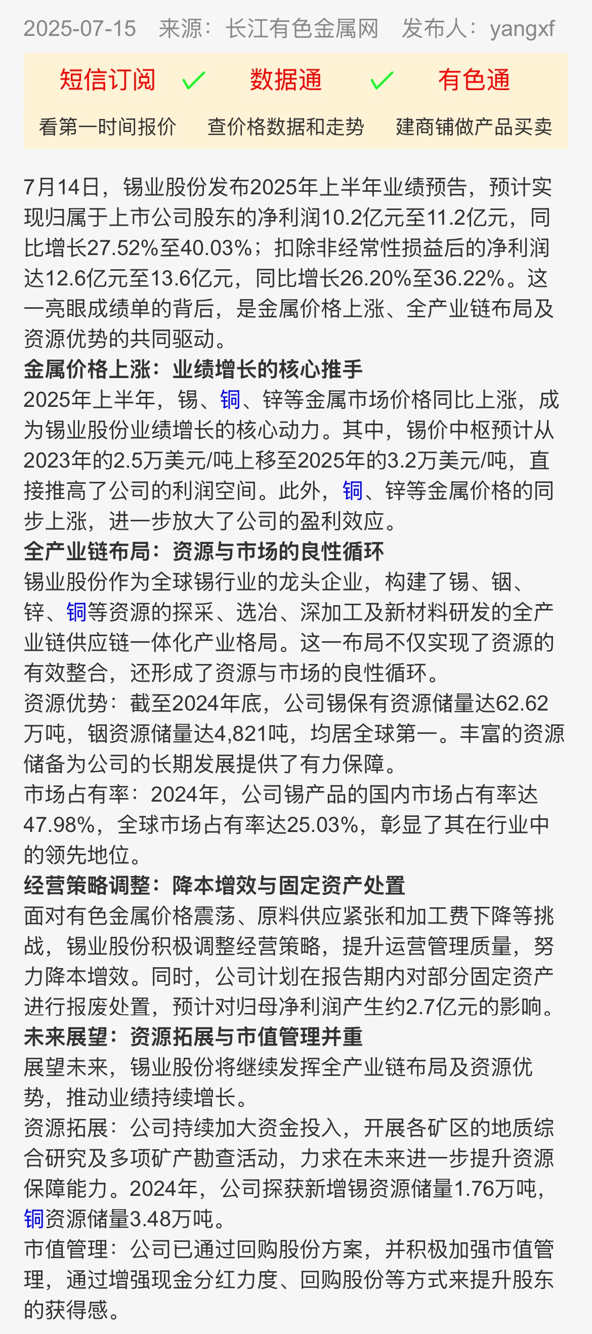 长江有色金属网:半年净利破10亿!金属价格飙升+全产业链优势,锡业股份为何能领跑行业?