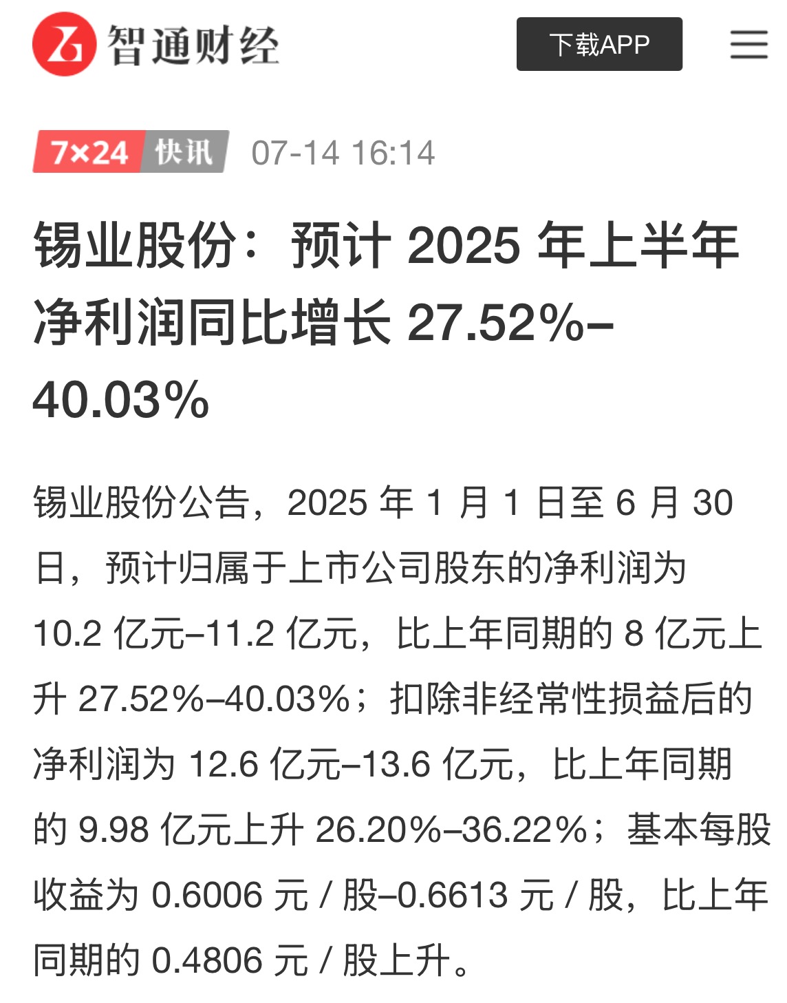 智通财经:锡业股份预计2025年上半年净利润同比增长27.52%–40.03%