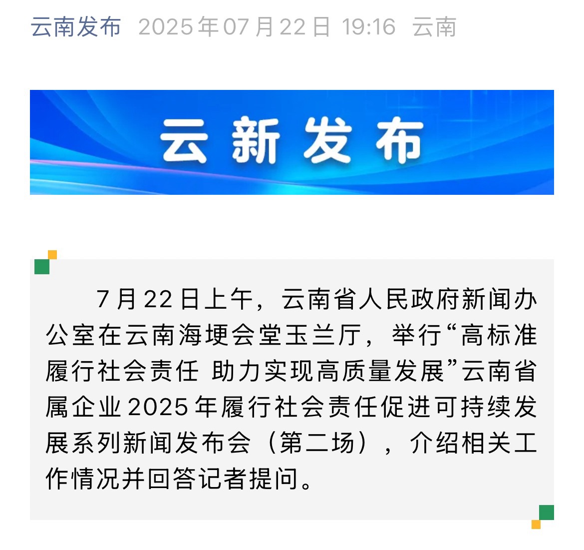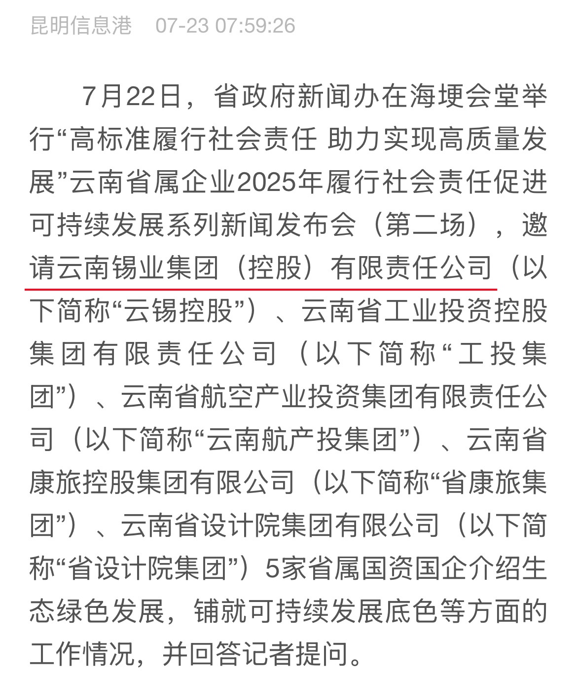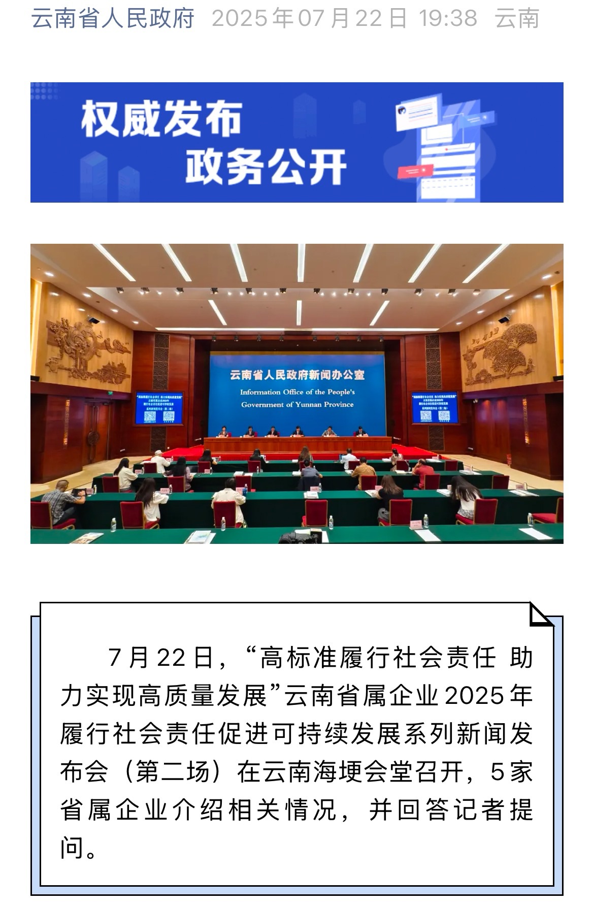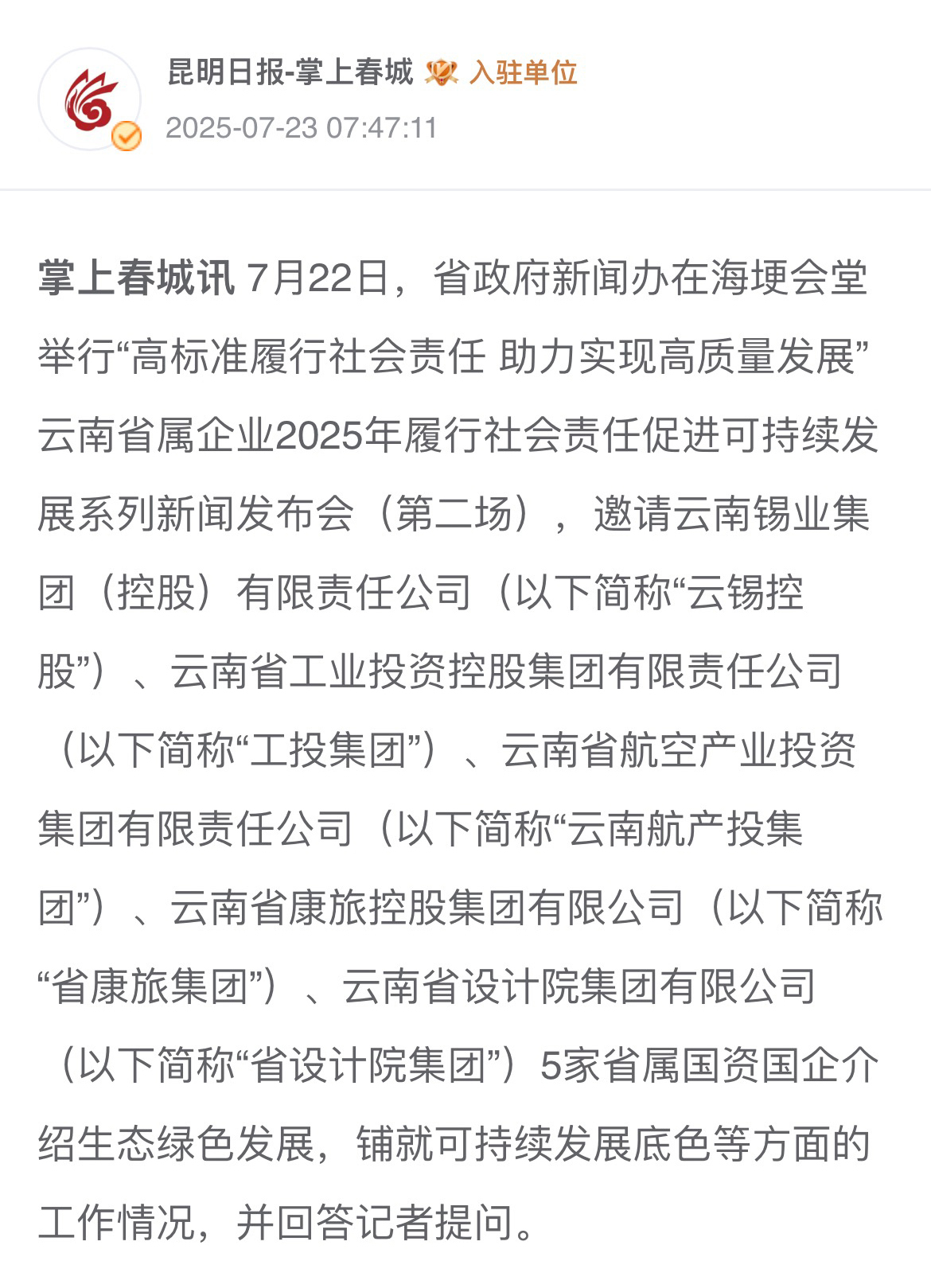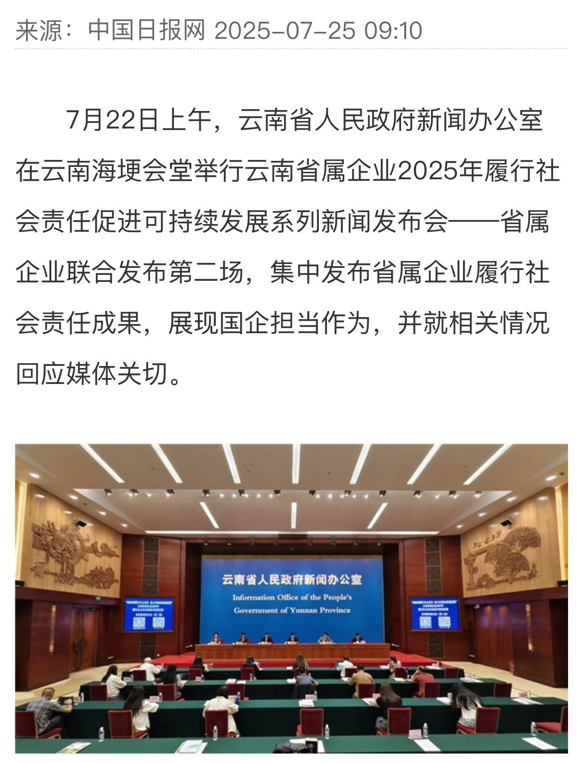 来源:央广网、央视影音、新华网、新华时讯、中国日报网、中国新闻网、中国网云南新闻联播、云南卫视晚间新闻、云南发布、云南日报、云南日报-云新闻、云南网、七彩云端、云南省人民政府、云岭先锋网、云南国资、云南政协报、有色金属报、有色新闻、腾讯新闻、今日头条、搜狐、网易、新浪微博、新浪财经、都市时报、国泰君安、昆明日报、春城晚报、昆明信息港、开屏新闻